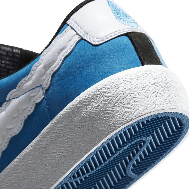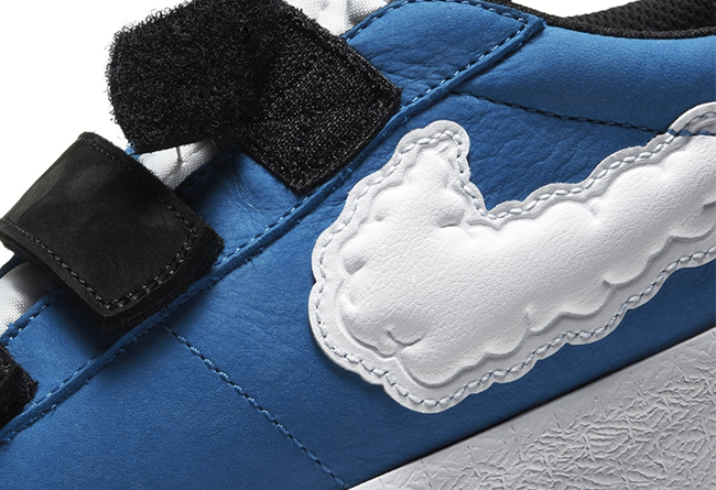这款联名选择以蓝色搭配黑白细节诠释,鞋侧云朵造型的 Nike Swoosh 堪称点睛之笔,与鞋身鞋身呼应营造出蓝天白云风景。而黑色魔术贴设计,又与清新的场景形成反差,突显滑板爱好者酷酷的风格。