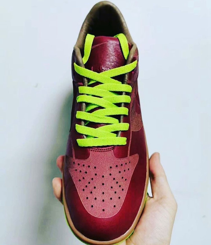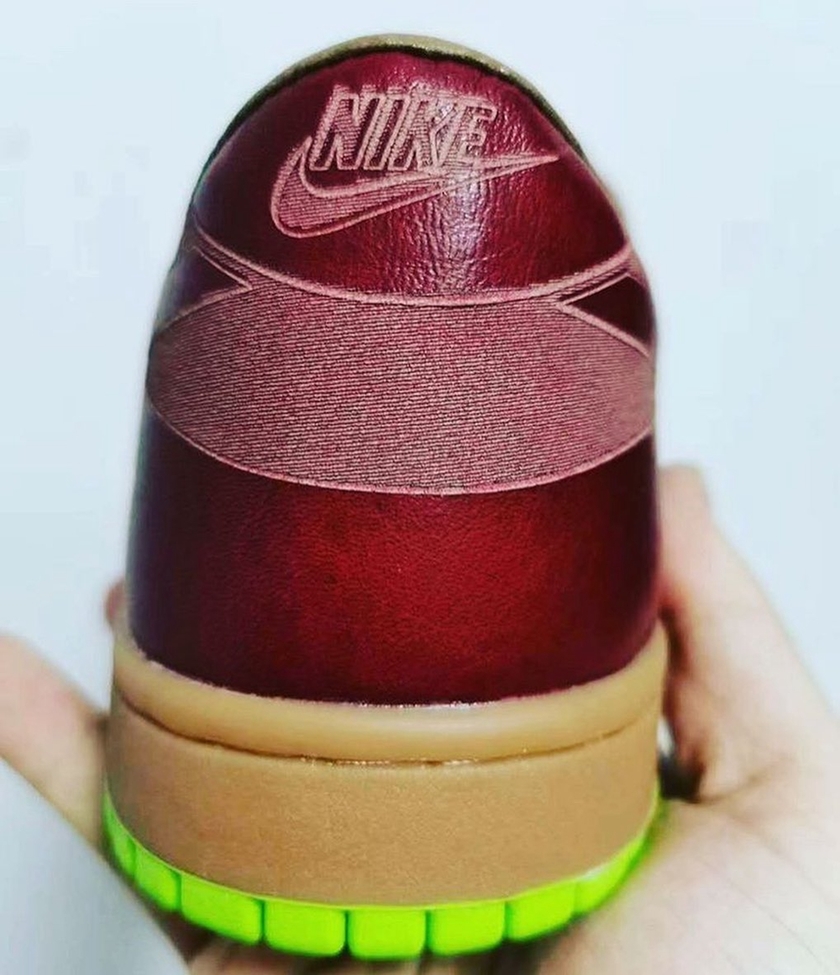 整双鞋以酒红色调主打,搭配生胶色中底以及荧光绿外底,撞色效果明显,视觉冲击强烈。