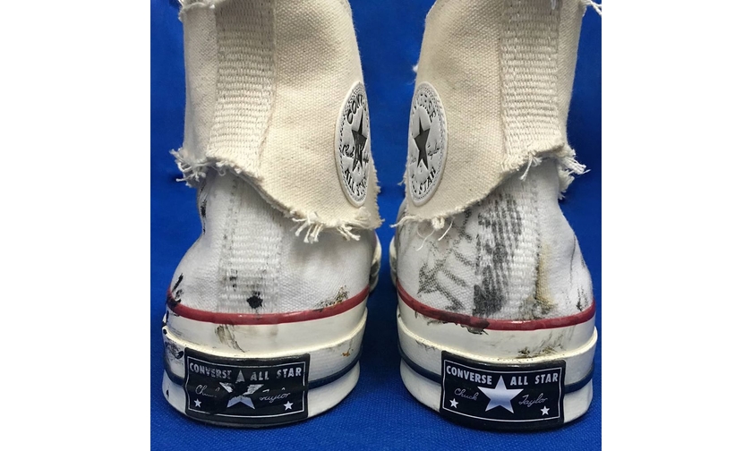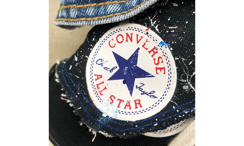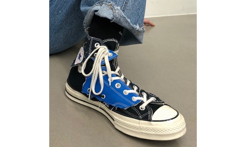 在原本的鞋型基础上,以解构形式加入了 ADER Error 代表性的蓝色帆布,并以涂鸦、拼贴等多重手法赋予 Chuck 70 全新时尚定义。欣赏一下,黑色款确实挺让人心动的。