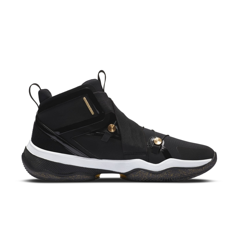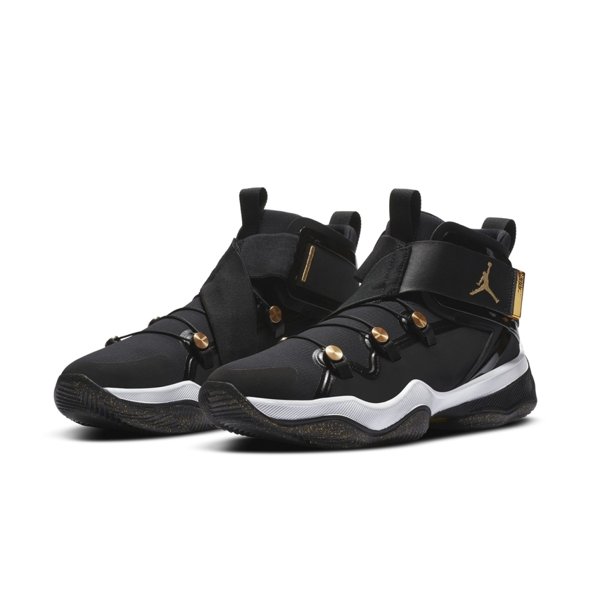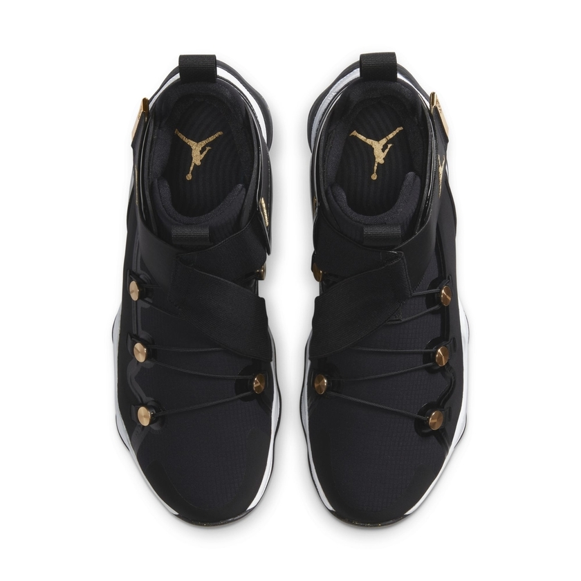 整双鞋采用经典黑金色调主打,整体造型乍一看颇像高帮 Air Jordan 11 。机能感十足的鞋带系统,搭配魔术贴绑带设计,营造出前卫时尚感。黑色漆皮材质与金色细节的点缀,则带来华丽高贵气质。