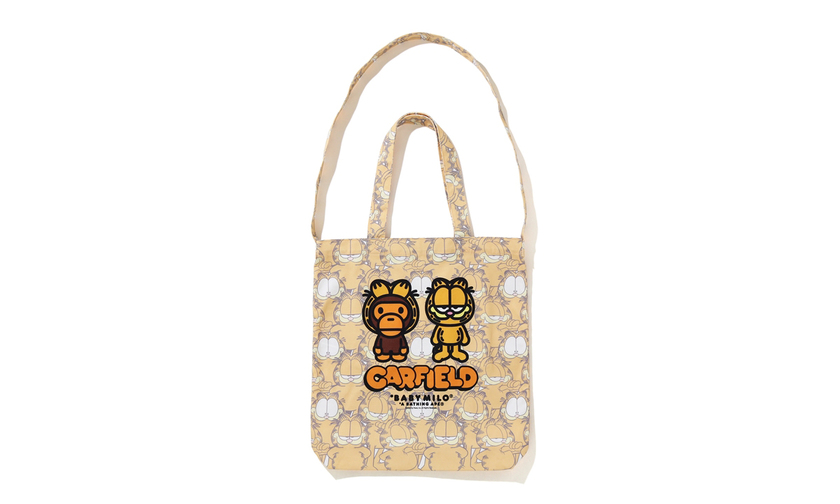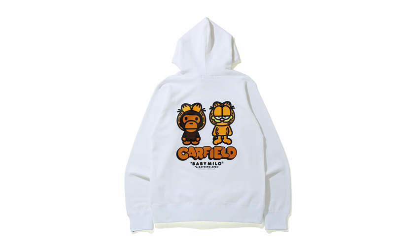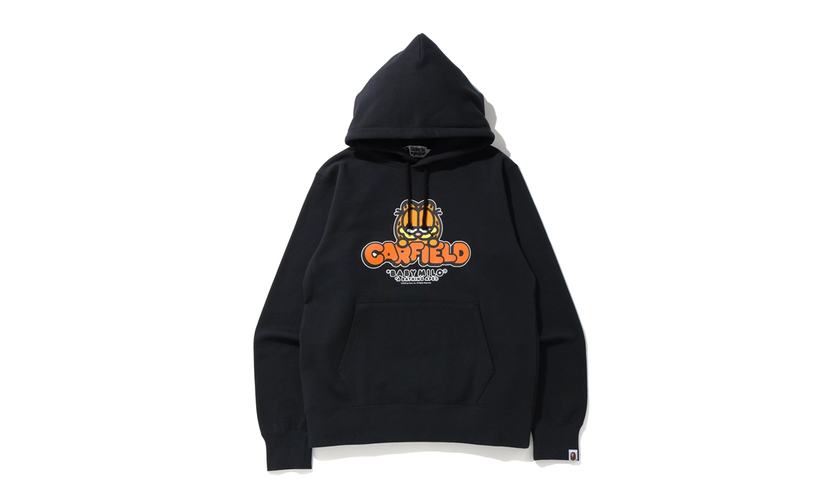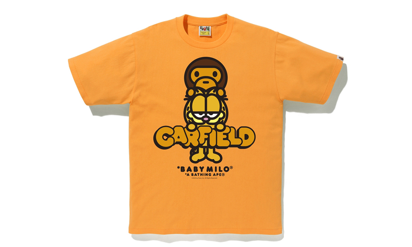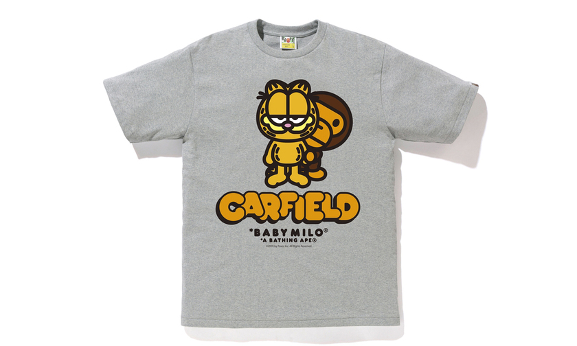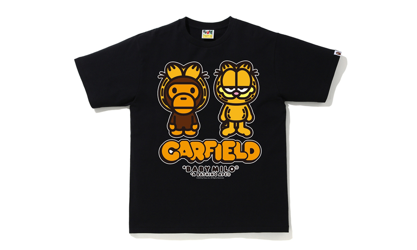 本次双方将加菲猫的经典形象与 BAPE 招牌元素猿人头、BABY MILO 等结合,带来了帽衫、T-Shirt、帽子和手提袋等单品。