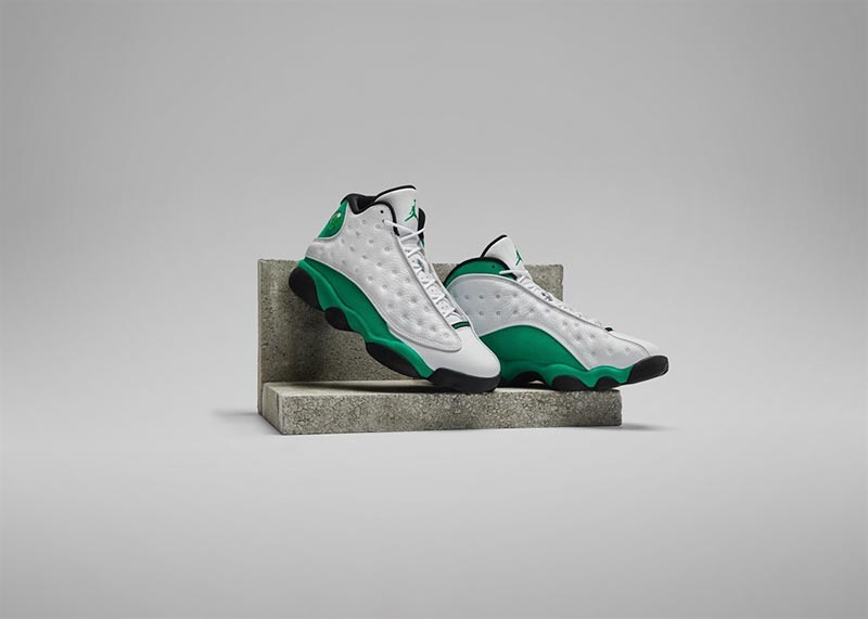 神似 2011 年的雷·阿伦 Air Jordan 13 “Three Point Record” PE ,白绿色调主打,皮革与翻毛皮材质塑造,规格不凡。沿鞋面轮廓勾勒的一圈 3M 反光带则是最大亮点,暗光下耀眼无比。