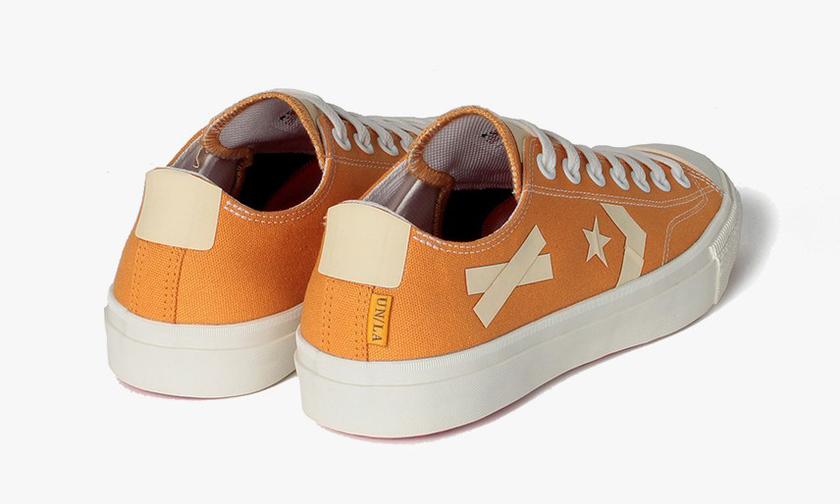 本次双方共推出橙与黑两种配色,将滑板元素与街头时尚糅合的设计理念延续,采用单色帆布与乳白色胶带印花进行点缀。黄色 Union logo 标签位于鞋跟处,点名联乘身份。