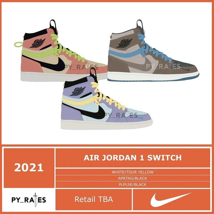 近日期,知名球鞋爆料账号 @py_rates_ 已经陆续为我们曝光了数款 AJ 1 效果图,总共 13 双。其中三款名为 Air Jordan 1 Switch ,分别以粉、蓝、灰色调主打。最特别的设计在于鞋帮处环绕脚踝的拉链设计,打开便能成为一双低帮 AJ 1 。买一双鞋能有两双效果,估计会成为不少潮流玩家的新宠。