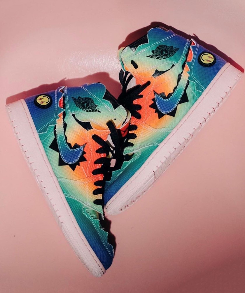 这款AJ1采用彩虹色的扎染工艺配合帆布材质呈现主要鞋面,,内层则是皮革材质,可以说休闲和质感兼具。在鞋头和鞋帮处都采用了锯齿状的设计也让鞋款更具辨识度。后跟辅以一个J Balvin的黄色笑脸logo更是个性十足。如此高规格的鞋款本来将会迎来市售本是众大消息,可是今年因为疫情原因则一直延迟,据最新消息可能将于今年11月份发售,虽然还需等待一些时日,但是无疑值得期待。