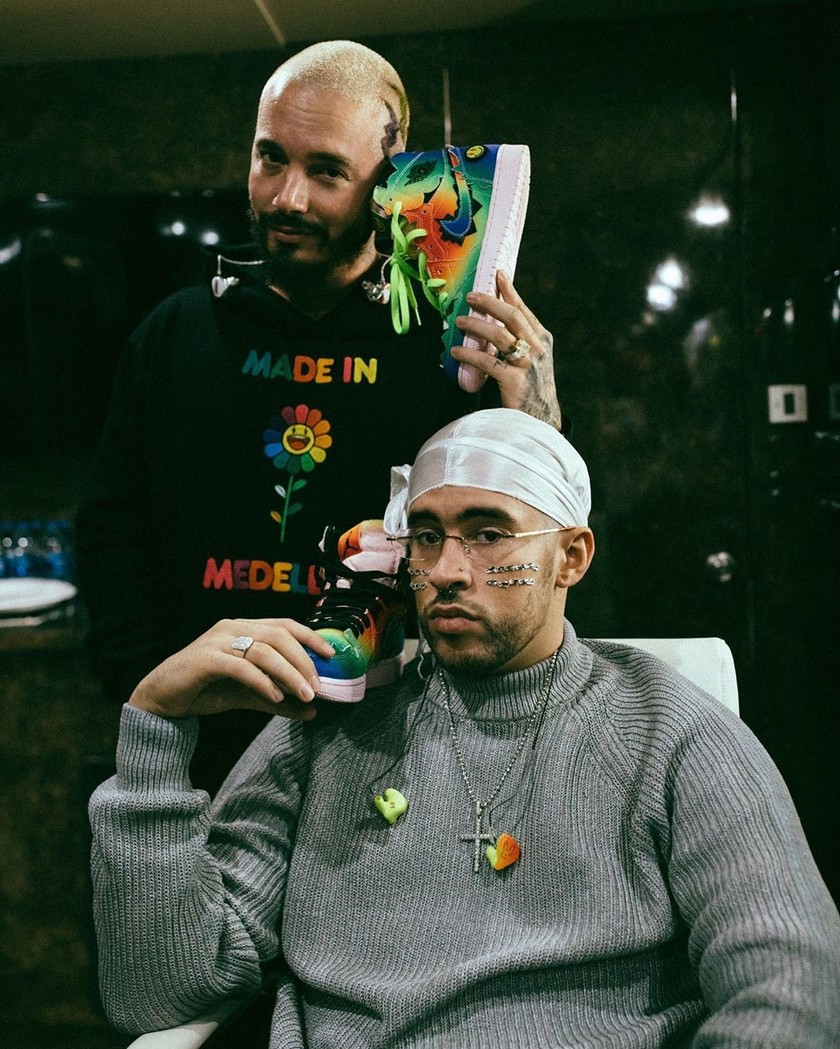 要提起耀眼的彩虹色,其实在今年伊始有一双鞋就通过该设计吸引了众多鞋迷的目光,是一双和雷鬼歌手J Balvin联名设计的AJ1,后者在今年年初举办的超级碗中场秀中上脚可以说引起了大家的一片骚动。