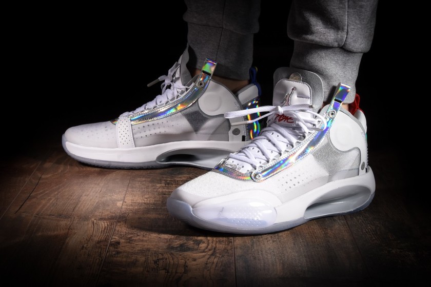 除了像“年轮”这样的OG鞋款推出彩虹色之外,最新一代的AJ正代鞋款AJ34同样将这一点融入到了新配色的设计中,在今年年初就推出发售受到了广泛的好评。鞋身整体看似采用了平平无奇的纯白配色搭配蓝色水晶底,但在鞋带细节和后跟都做了相当吸睛的全息炫彩设计,光打在上面会有不同的光泽呈现。
