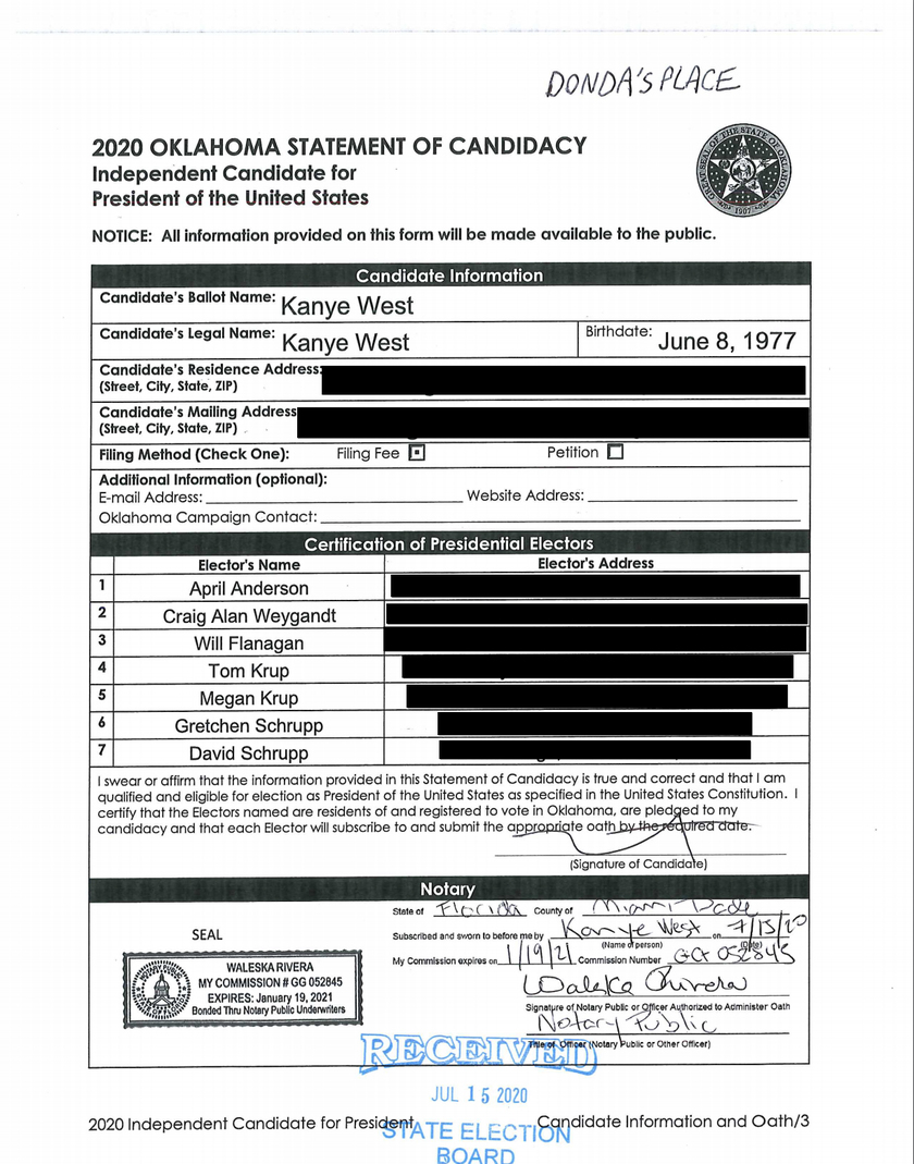 继前天侃爷竞选团队的成员 Steve Krame 向外媒透露侃爷已经退出竞选之后,今日事件再次发生戏剧性反转。据外媒报道,侃爷并没有退选,他已在截止日期前在俄克拉何马州报名,并成功获得了俄克拉荷马州的独立候选人资格。