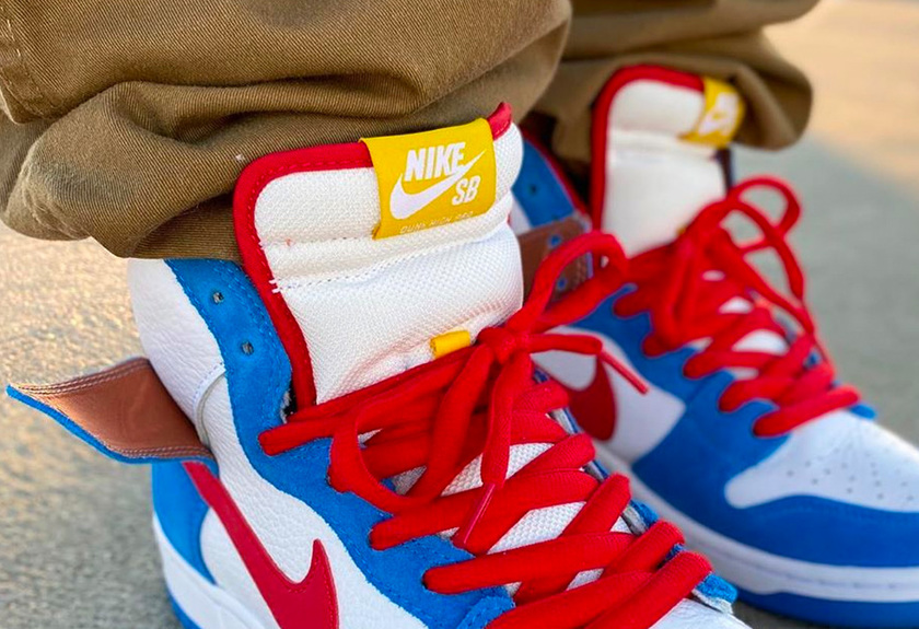近日曝光引发热议的哆啦A梦主题配色 Nike SB Dunk High 此番释出了更多细节和上脚照。由滑板摄影师 Kevin Perez(@kevperez)率先展示。