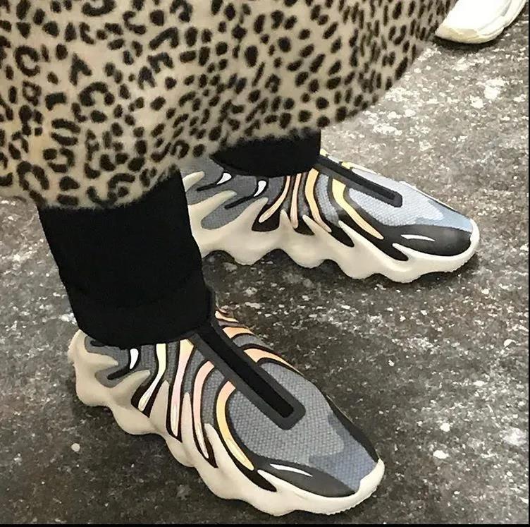 依旧是一体式编织鞋面搭载火山造型鞋底,新配色采用了灰色搭配渐变色调设计示人。