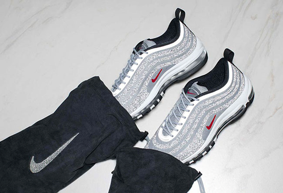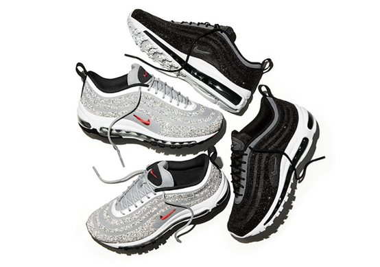 而除了这次的低调款,这也不是施华洛世奇和球鞋品牌第一次合作,早在几年前施华洛世奇就和NIke展开联名合作,在Air Max 97上呈现。标志性的波纹轮廓使用施华洛世奇水钻呈现,整个鞋身总共多达5500颗水钻,华丽程度可以说是无所能及。