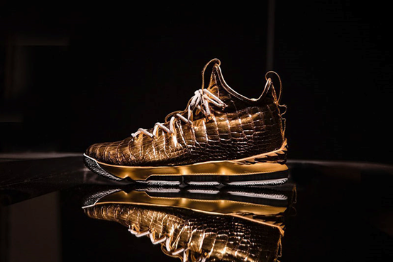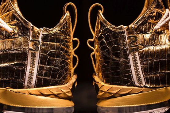 看完了市售款让我们看看非市售版本的珍贵鞋型,两年前詹姆斯成为NBA历史最年轻的3万分先生,为了纪念这个时刻,洛杉矶知名的球鞋客制团队专门制作了一款特制LBJ 15。这双鞋可以说是真正意义上的穿金戴银,鞋面全部使用鳄鱼皮皮革制作,外观配色上是金色装饰,而那也并不只是涂色而是用24K黄金镀制。