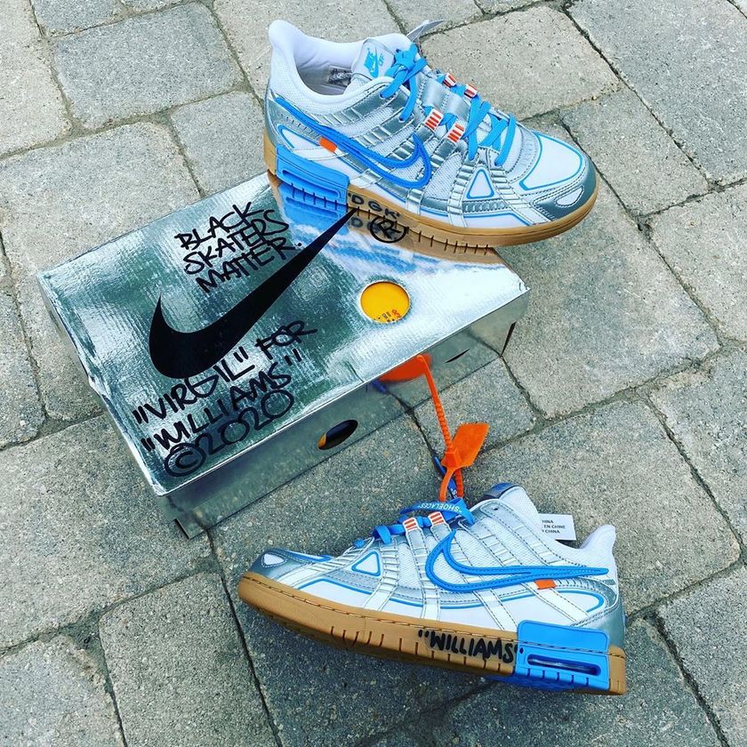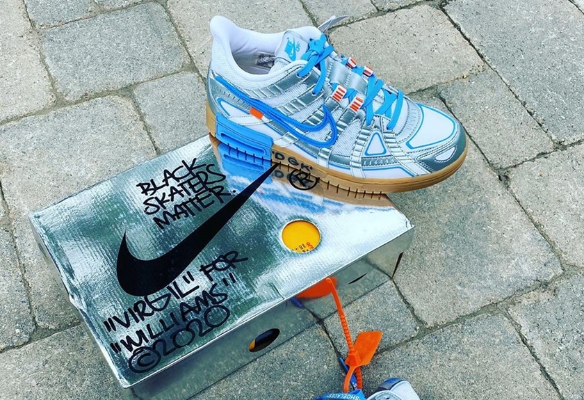 他收到的是白蓝配色亲签,在设计上与此前曝光的普通实物一致,区别就是 Virgil 在这双鞋的中底上写上了 “VIRGIL” 、“DGK”、“WILLIAMS” 等字样,并且还在鞋盒上写上了 “BLACK SKATERS MATTER”、“VIRGIL”FOR “WILLIAMS”等标语,表明是独一无二的亲签版。