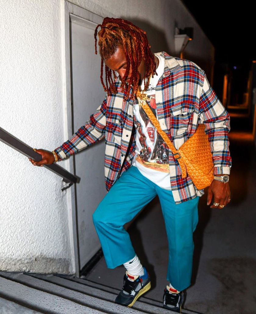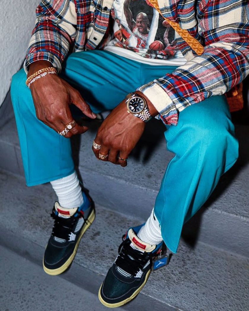 @stylelikekay 身穿白 t +格子衬衣,以一条孔雀蓝长裤及一双白袜搭配 Union x Air Jordan 4 。长裤的蓝色恰好与 AJ 4 联名鞋帮处的蓝色呼应,再通过白袜的映衬,整体气质街头又复古,同时还散发着高级感。