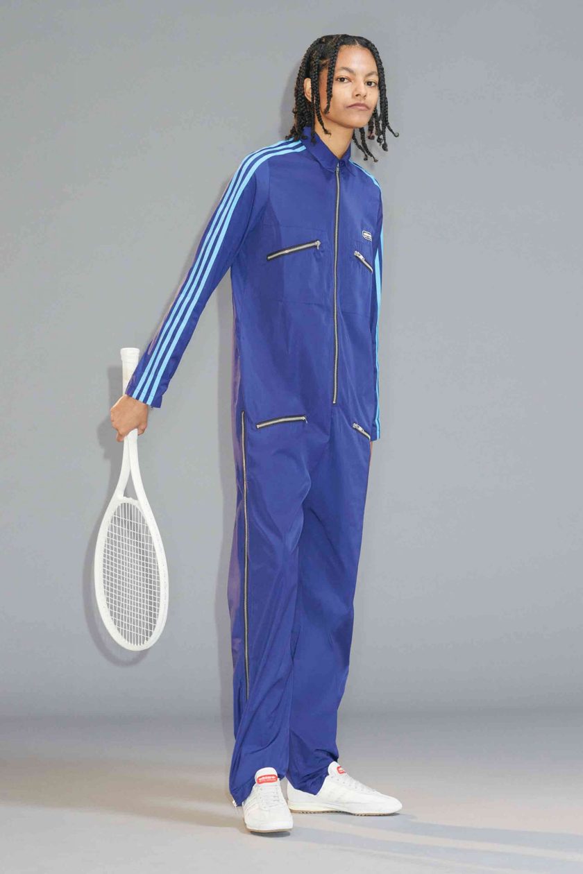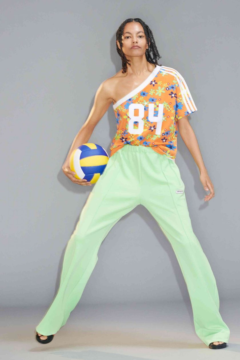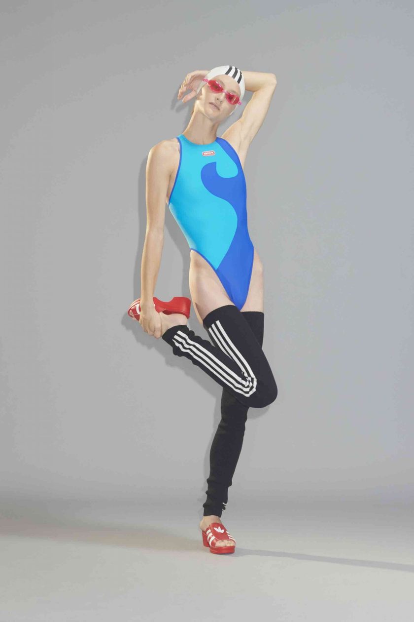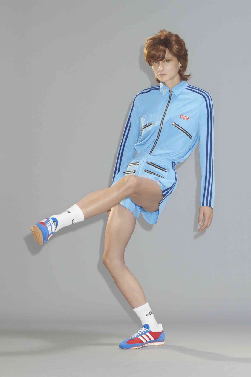 成衣方面致敬了 adidas 不同年代的出彩设计,推出俏皮十足的露肩不对称上衣,自成一派又别具个性主张的大胆撞色休闲运动服,蓝色系的连体衣、风衣夹克和短裤,以及充满复古气质的连体泳衣、网球风格短裙和连衣裙。