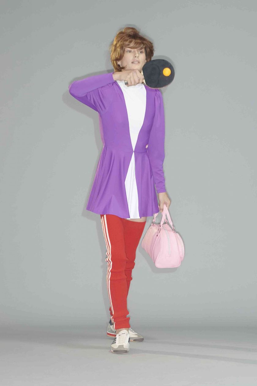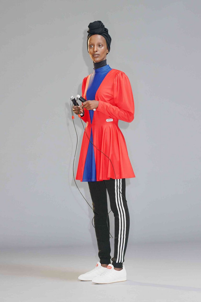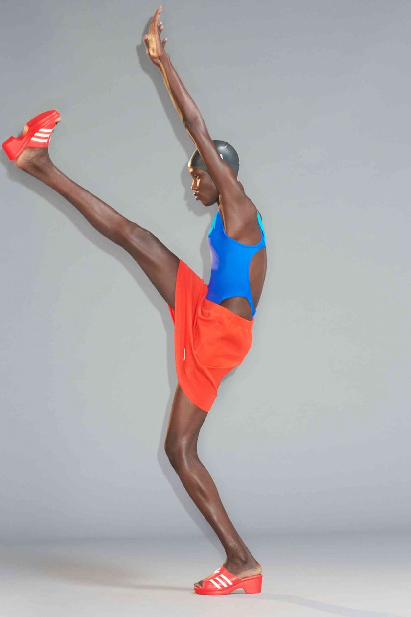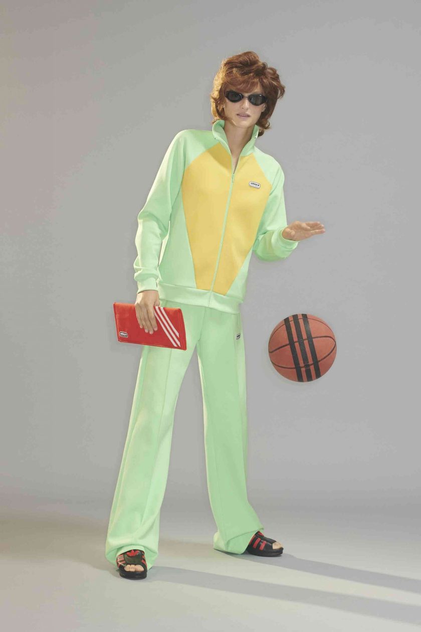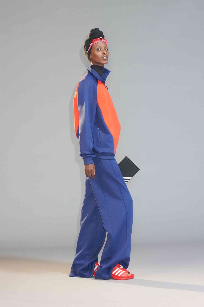 成衣方面致敬了 adidas 不同年代的出彩设计,推出俏皮十足的露肩不对称上衣,自成一派又别具个性主张的大胆撞色休闲运动服,蓝色系的连体衣、风衣夹克和短裤,以及充满复古气质的连体泳衣、网球风格短裙和连衣裙。