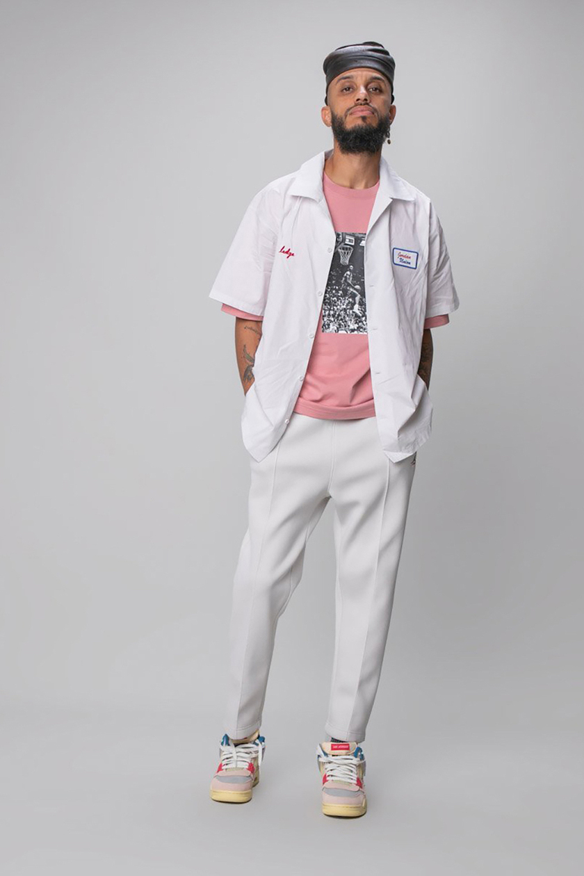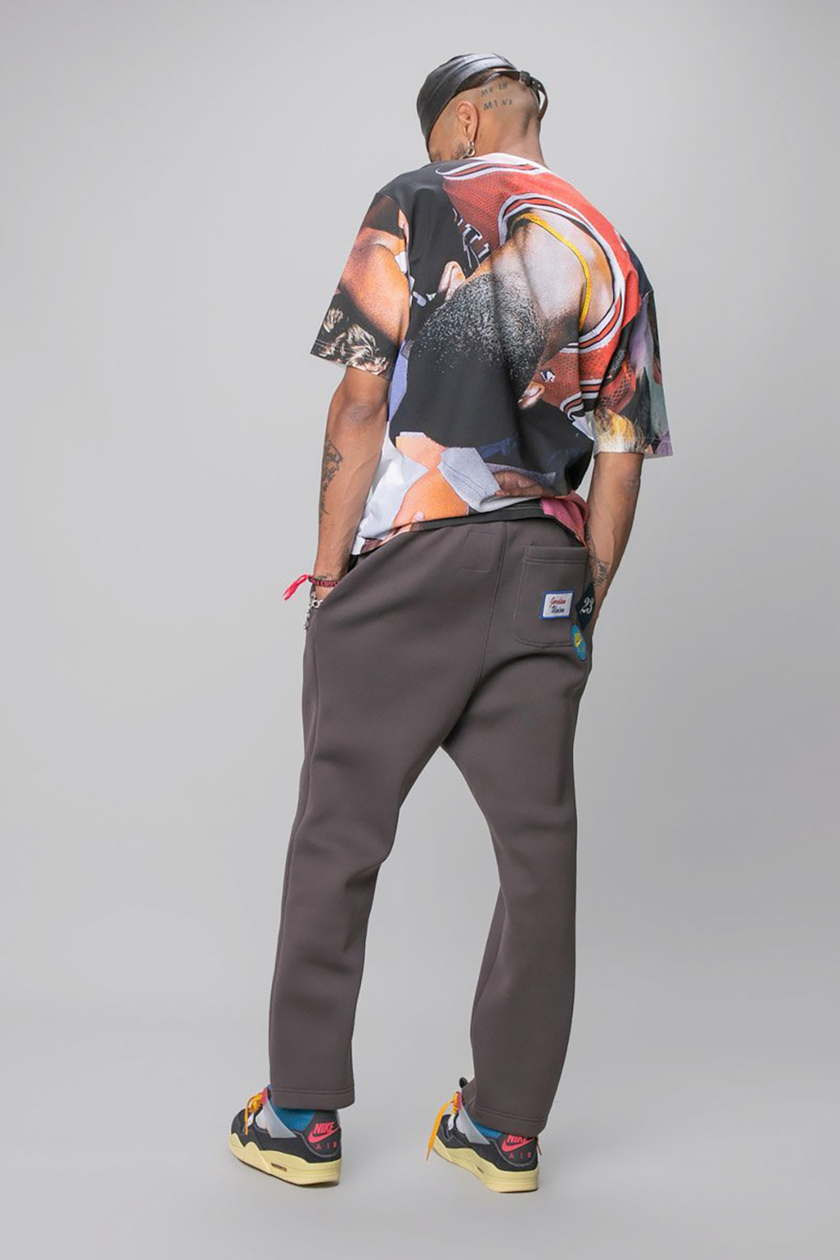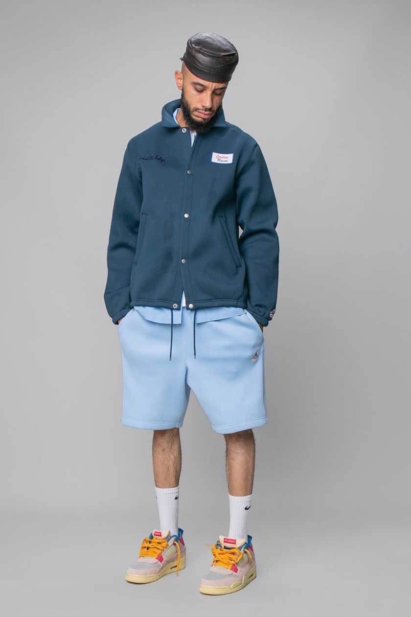 服饰系列包括 T恤、短袖衬衫、裤装等一众单品,色调上迎合鞋款的蓝、粉色调,注入具有年代感的印花,不禁让人回忆起 Michael Jordan 的时代。