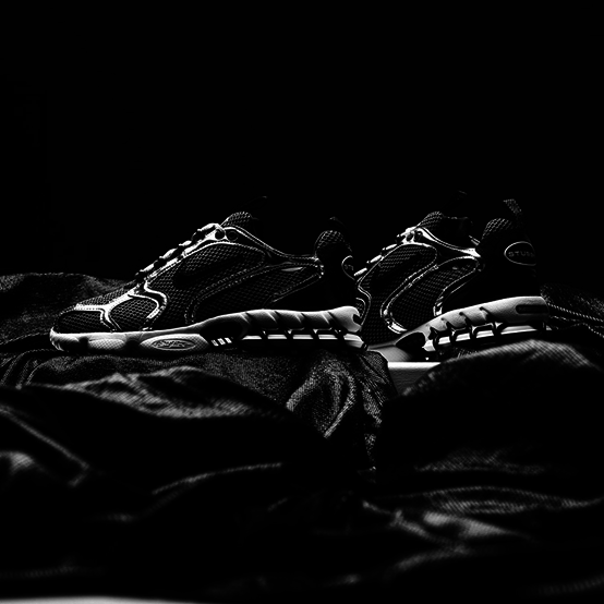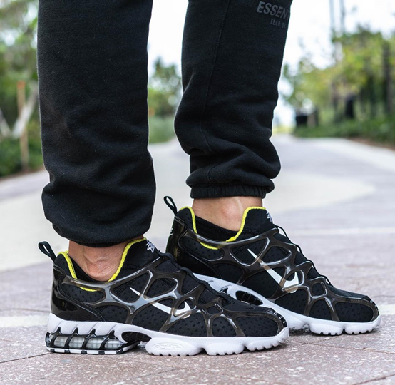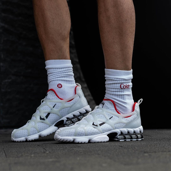 然后看向跑鞋系列,Stussy x Nike在今年的联名鞋款Air Zoom Spiridon Cage 2无疑给大众带来了颇多惊喜。呈现一黑一白两款不同配色的款式各具特点,黑色款式使用织物网布拼接了高亮漆皮材质呈现鞋面,白色款式则是帆布拼接粗制网布。风格在新潮感和复古性之间之间切换来去自如。后跟在Zoom气垫的加持下还有特别的笼状结构包覆,外观上颇具冲击感。