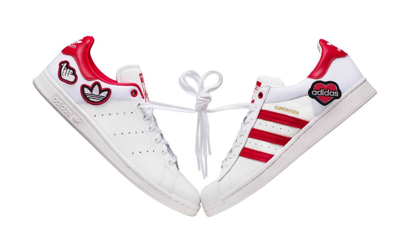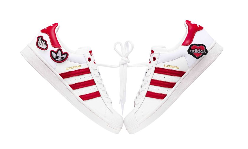 Superstar 鞋款则将侧身的标志性三杠线与鞋尾用中国红呈现,搭配同款个性魔术贴,经典鞋款瞬间高街潮流。