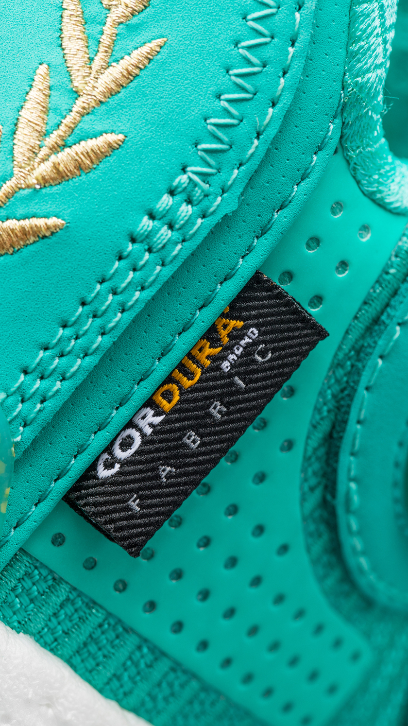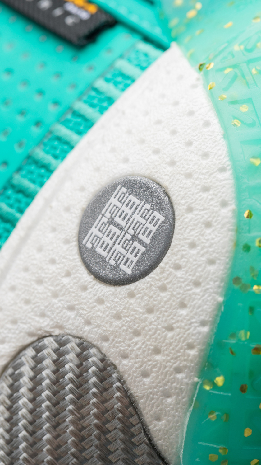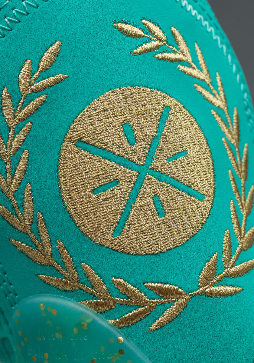 而本次韦德之道 8 “自由”则采用了蓝绿色装扮呈现,搭配金色细节点缀,呼应自由女神像造型。后跟金色橄榄枝刺绣极其精致,环绕韦德 logo ,表达自由与和平的内在意义。