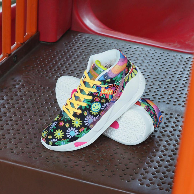 这款配色鞋面以黑色打底,五彩斑斓大小不一的太阳花图案覆盖,不仅吸睛度爆棚,还颇有村上隆联名既视感。