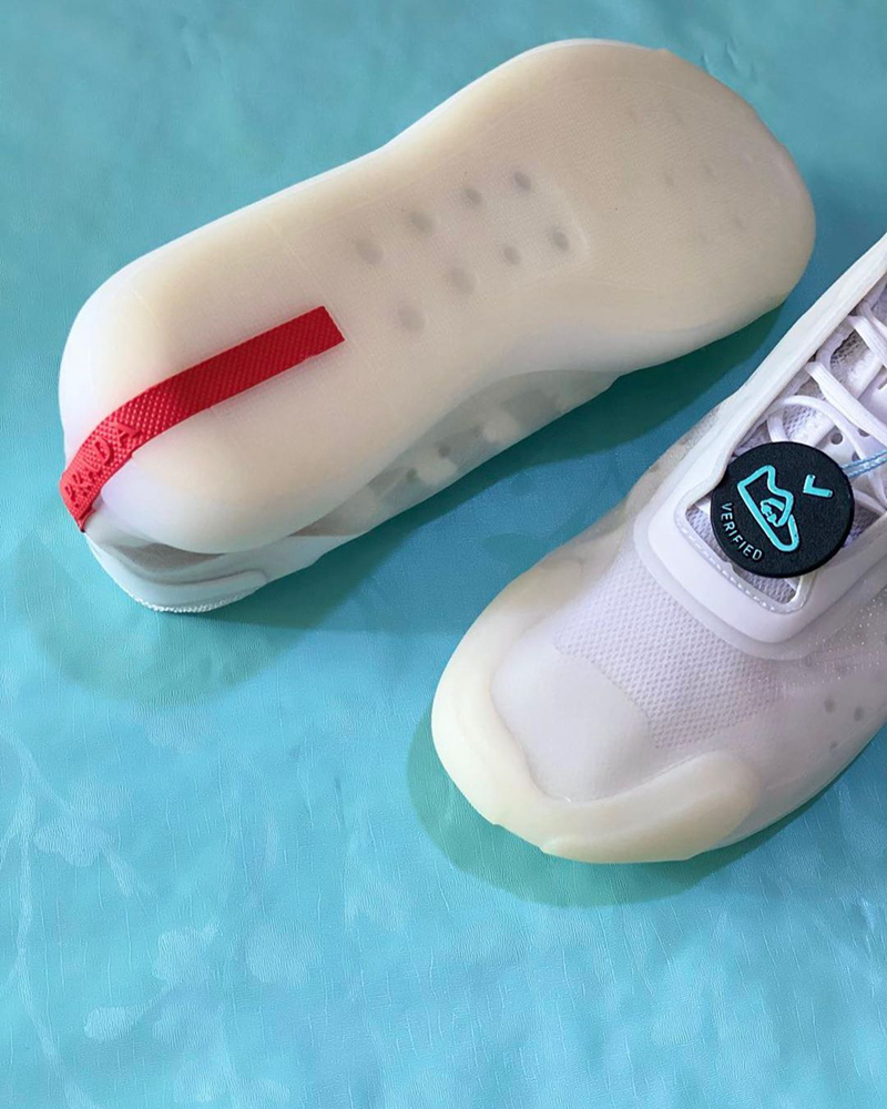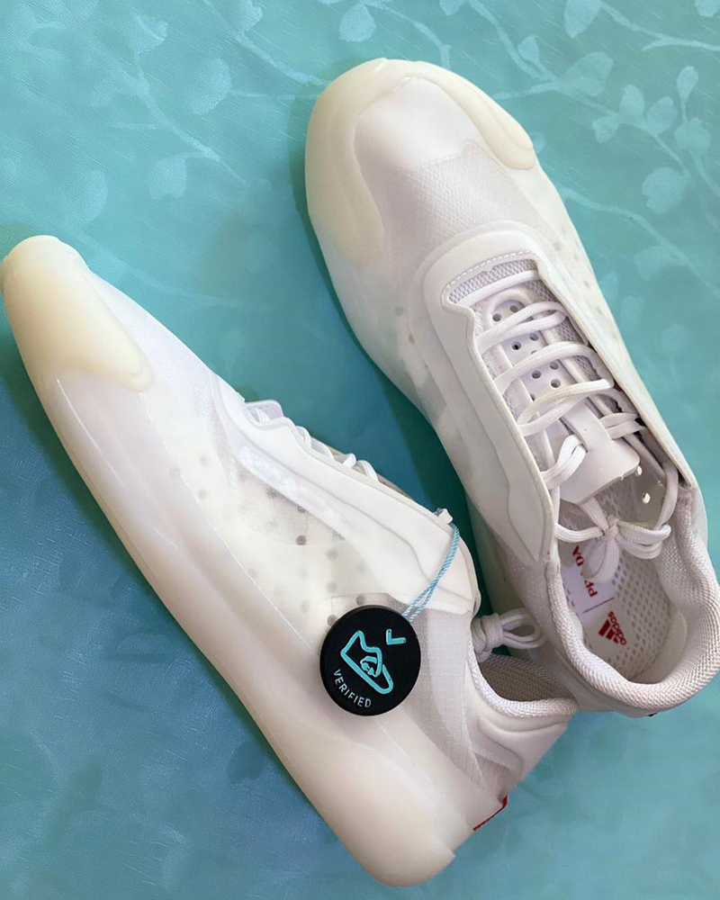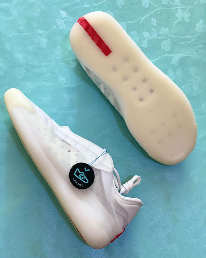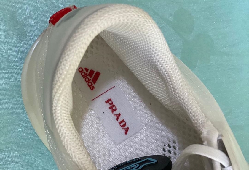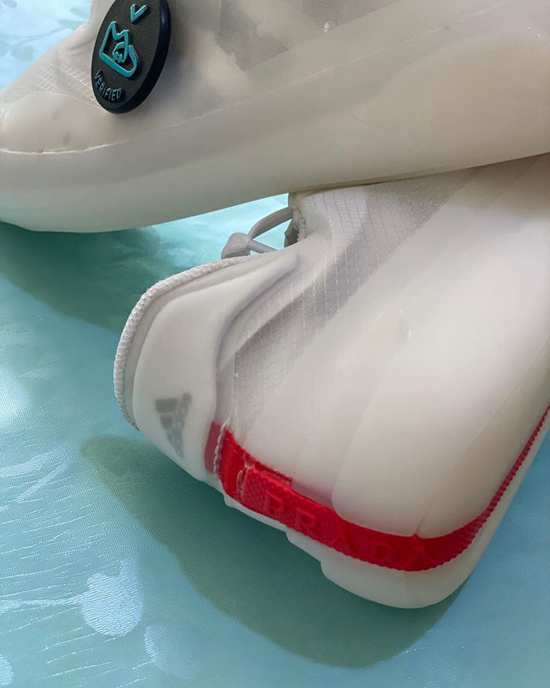 Prada x adidas 联名 2.0 采用乳白色贯穿鞋身。半透明类似蝉翼的材质塑造鞋面搭配乳白色中底外底,视觉纯净高级。