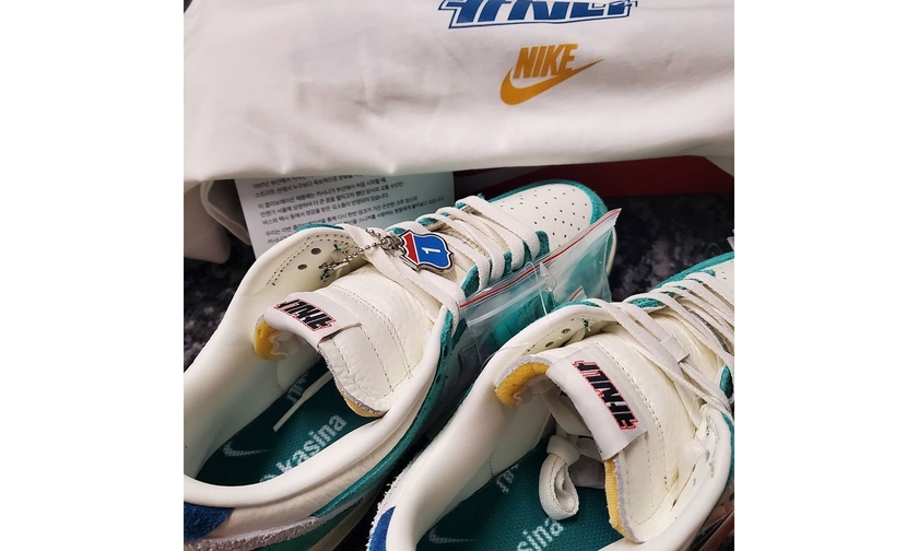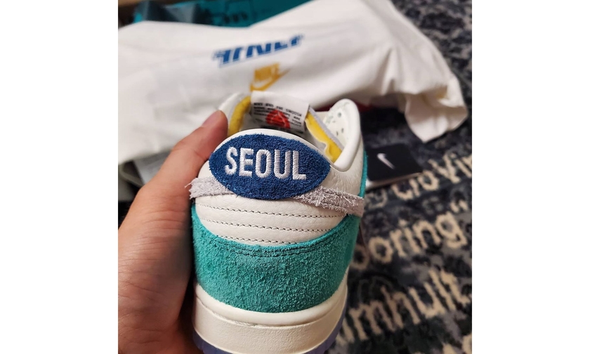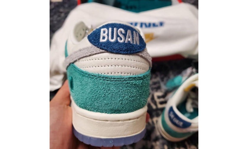 细节处,鞋头反差色 Mini Swoosh 提升鞋款辨识度,后跟 Kasina 标识与鞋舌韩文字样表明联名身份。另外,后跟绣有 BUSAN(釜山)和 SEOUL(首尔)字样,似乎表明韩国限定身份。