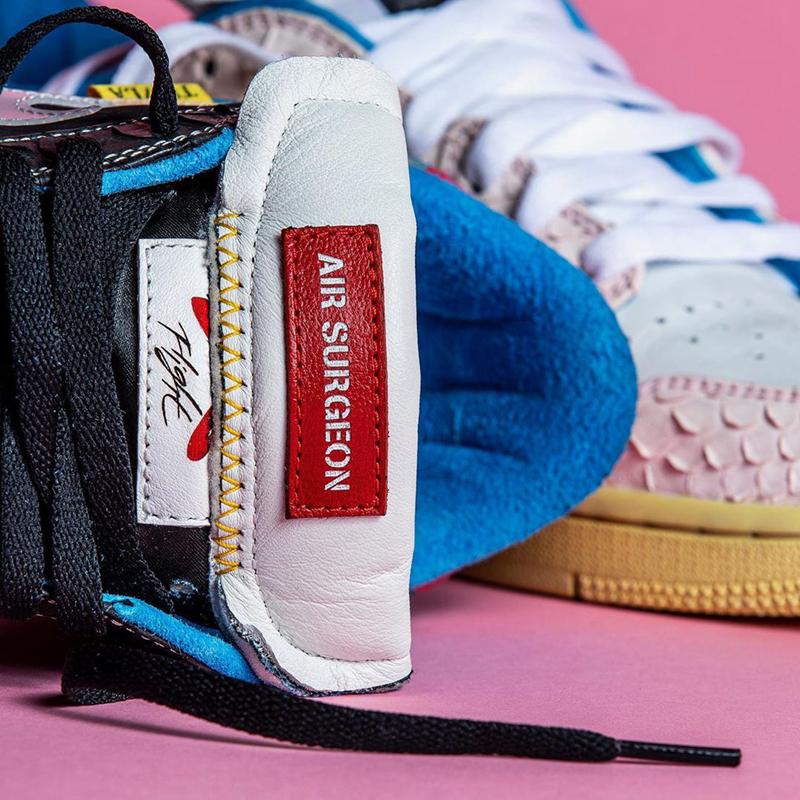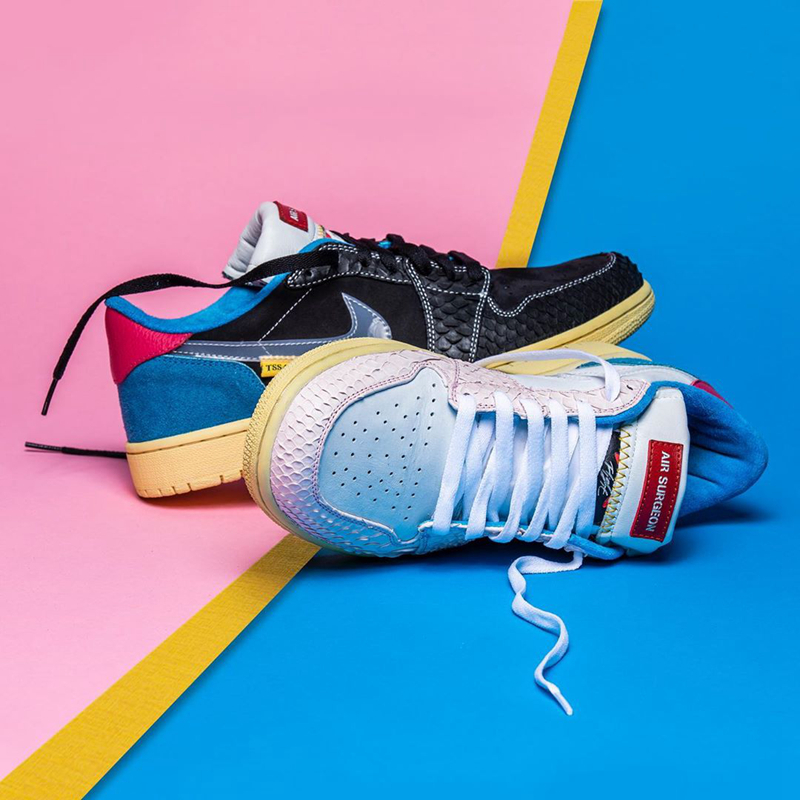 以超奢华材质和顶级做工征服无数鞋迷并享誉全球的洛杉矶球鞋定制团队 —— The Shoe Surgeon,最近又以即将发售的 Union x Air Jordan 4 为原型打造了一款艺术品级别的 Air Jordan 1 Low 。黑色、蓝色、红色、粉色等 Union x AJ 4 两款配色标志性色调塑造,搭配超高规格仿蛇纹皮革,气质华丽。欣赏一下吧~