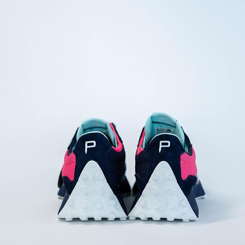 这款联名气质潮流又复古,全鞋以藏蓝色与浅蓝色主打,并以麂皮、帆布材质塑造。后跟处玫红色细节以及鞋侧波浪刺绣花纹堪称亮点,为整双鞋注入活力。