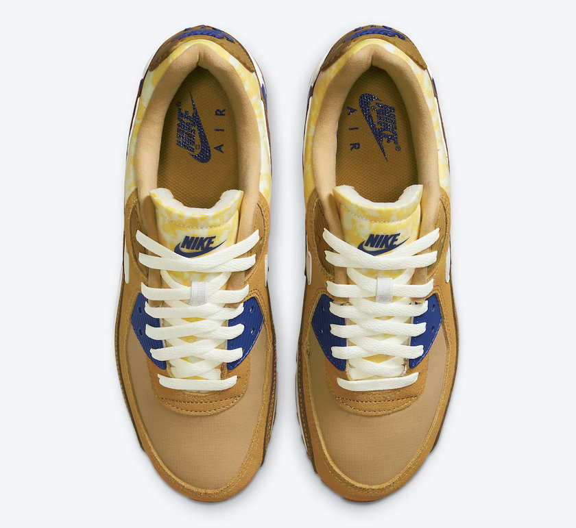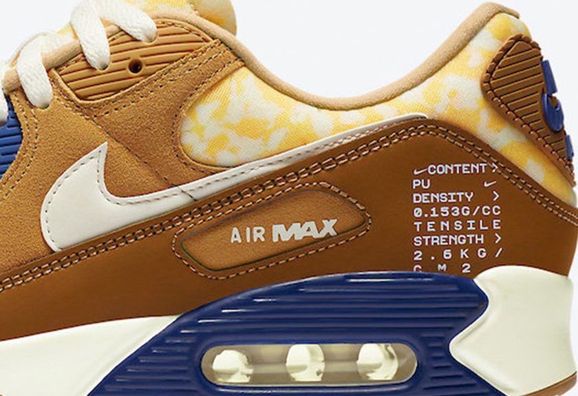 这款配色名为 Nike Air Max 90 SE “Chutney”,灵感源于 Chutney 酸辣酱,整双鞋也采用酸辣酱式配色演绎。深棕色主打,搭配蓝色细节,以及鞋领处的黄白酱色调花纹,点明设计主题。
