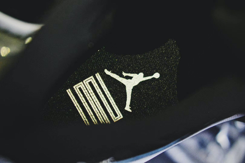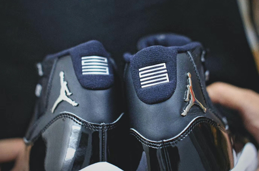 细节部分,标志性元年大漆皮,高级感极强的液态银色 logo 以及仅在 AJ 11 “DMP” 中出现过的 “JORDAN” 字样鞋带孔,堪称精髓设计,让人眼前一亮。