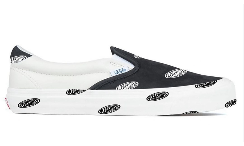 这款联名以 Vans 经典鞋型 Slip-On 为原型重塑,黑白撞色设计融入 PLEASURES 椭圆形 logo ,吸睛度与辨识度极强。