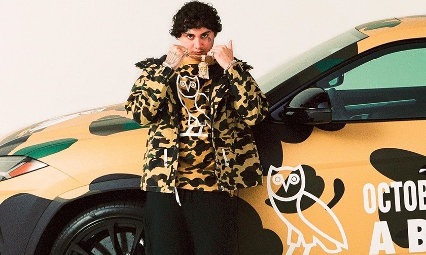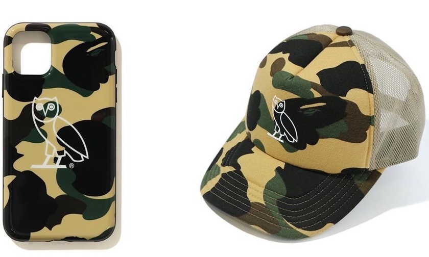 在设计上 A BATHING APE 经典的迷彩、猿人头与 OVO 的猫头鹰 Logo 的结合,辨识度极高,潮流属性也极强。