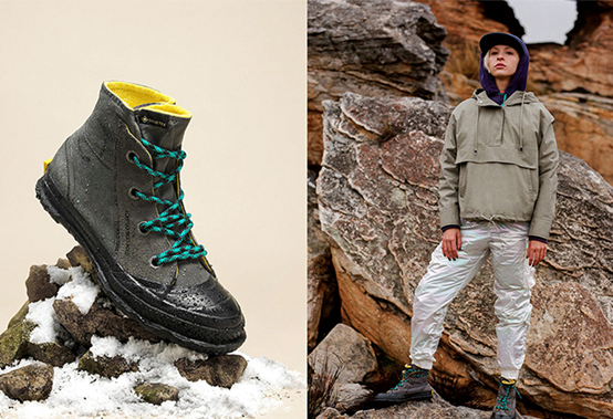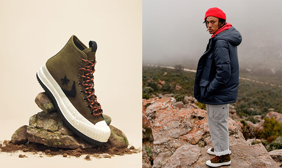 然后推荐同样原本是帆布鞋风格相对来说也是更加轻盈一些的Converse鞋款,专为秋冬季打造的户外款,穿搭感也非常强。鞋面在帆布材质基础上,加入GORE-TEX防水科技,可以时刻保持鞋身干爽,鞋头灯需要专门加固的位置使用类似硬质橡胶的材质保护,大底更是做了一定的加厚和深纹理加强耐磨和抓地力。