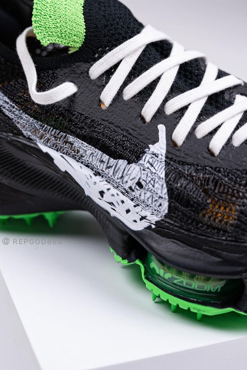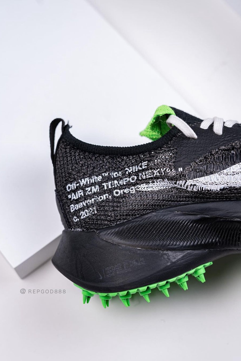 这款 Off-White x Nike Air Zoom Tempo NEXT% 以黑绿白色调主打,在造型上延续了专业级别马拉松跑鞋 Nike Air Zoom Alphafly NEXT% 的基本轮廓。
