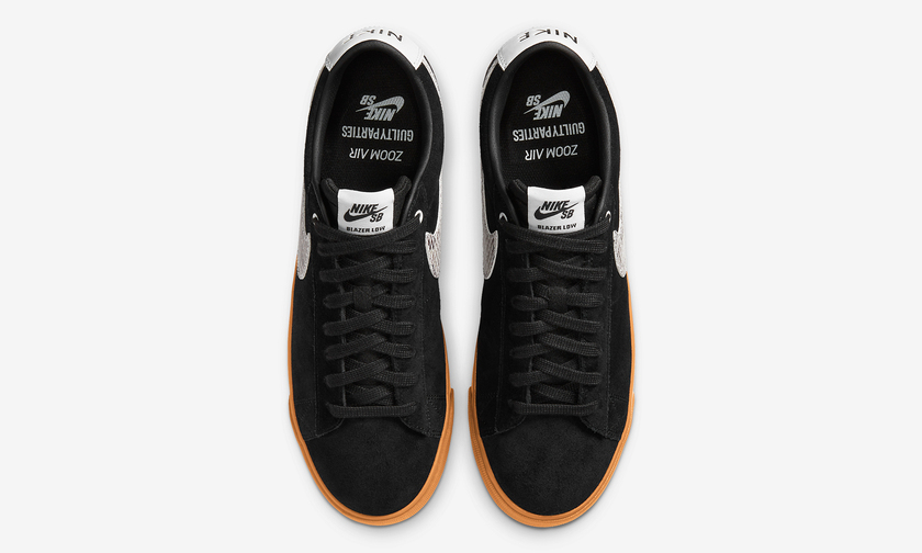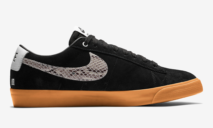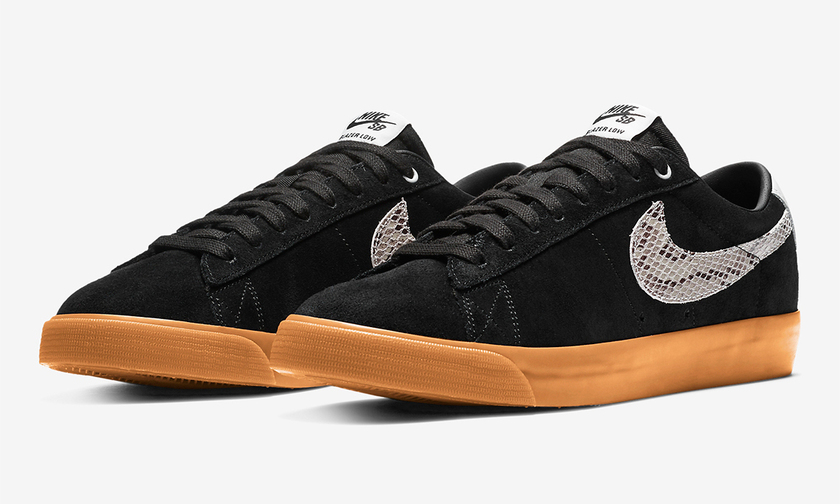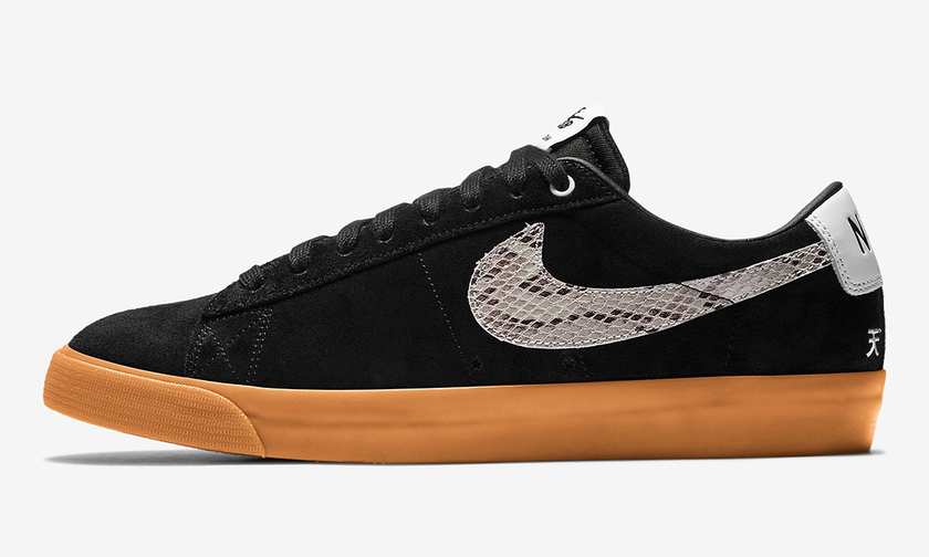 SB Blazer 则以黑色麂皮塑造,搭配蛇纹 swoosh 呈现。两双鞋后跟都点缀了“天国”、“东京”字样,辨识度极强。
