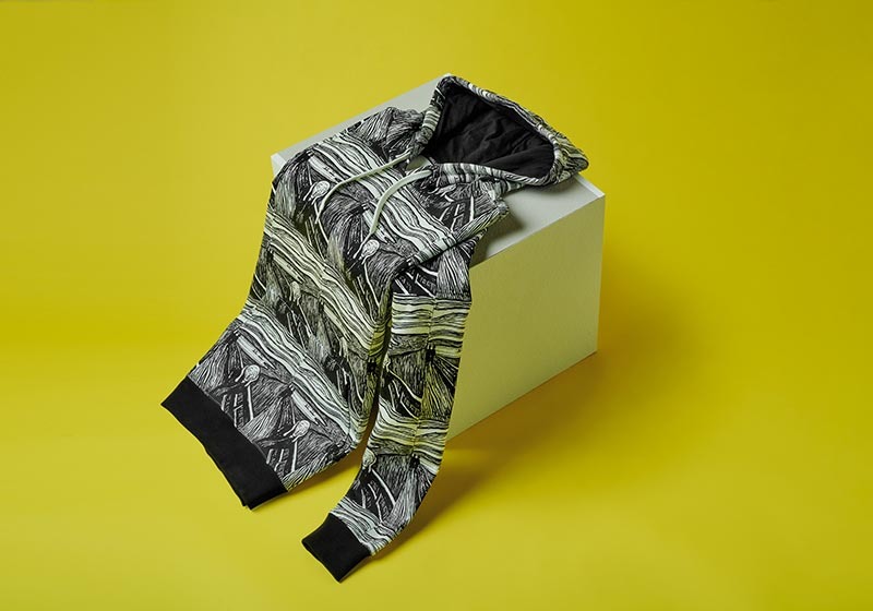 在设计上依旧以艺术作品主打,Edvard Munch 爱德华·蒙克最著名的作品《The Scream》,ackson Pollock 杰克逊·波洛克《One: Number 31》,以及艺术家 Popova 帕波瓦《Untitled》作品等等的注入,使得单品拥有强烈的艺术气息和街头潮流感。