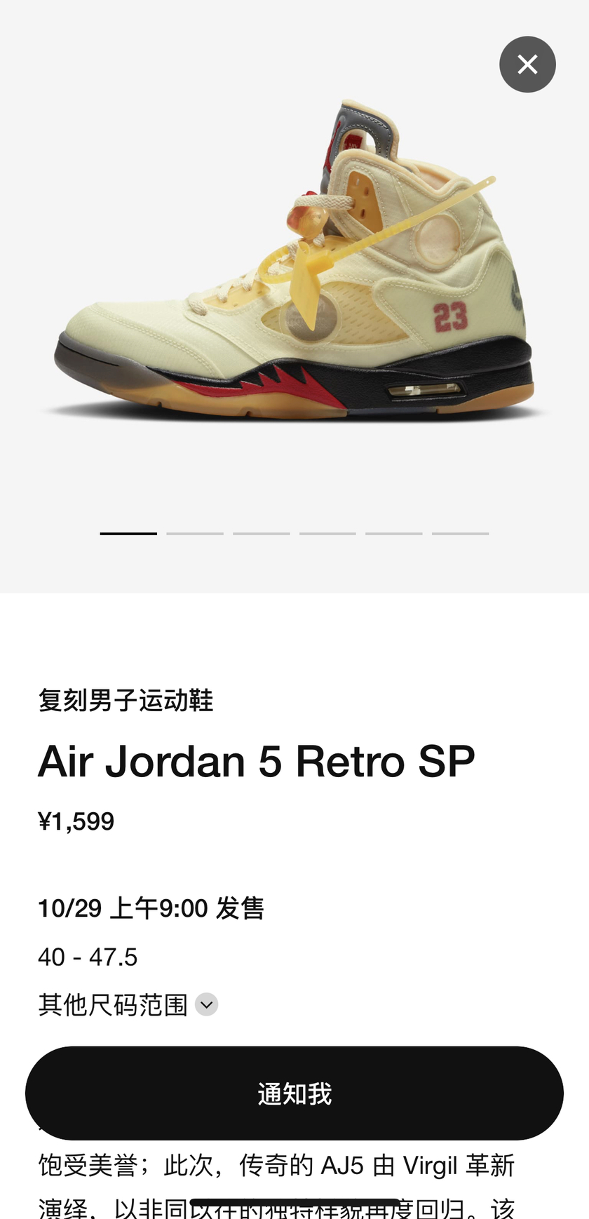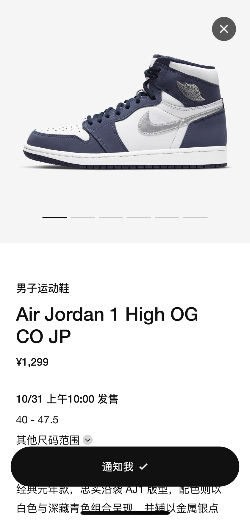 但没入手的朋友也别急着遗憾,本周接下来两天还有重磅将登场。分别是 10 月 29 日也就是明天上午 9:00 的 Off-White x Air Jordan 5 以及 10 月 31 日上午 10:00 的曾经的午夜蓝日限 Air Jordan 1 CO.JP 。