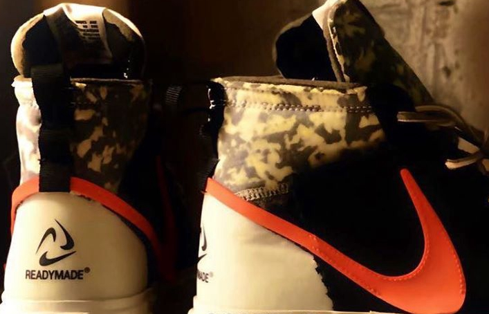 可以看到这款被“重制”的 Blazer Mid 采用黑色为基底,鞋帮部分以军事迷彩修饰,搭配点缀了 READYMADE logo 的白色后跟,以及巨型橙色 Swoosh ,整体视觉硬核帅气又极具活力。