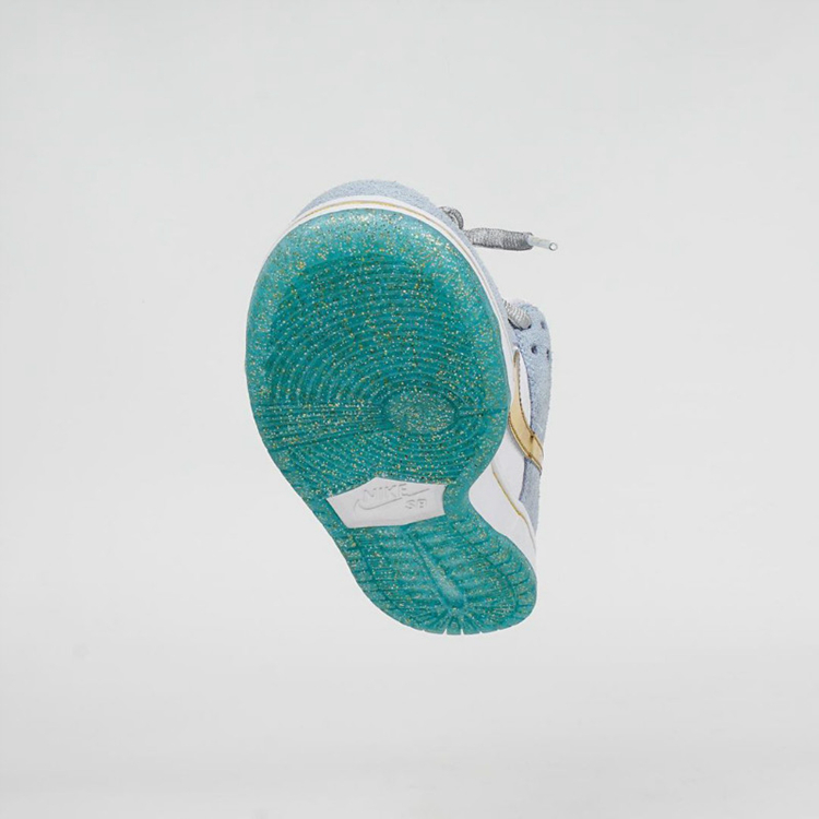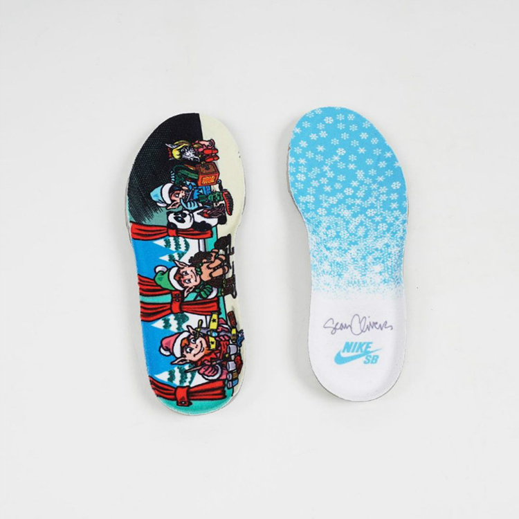 半透明金粉泼墨绿色外底加持,让整双鞋视觉效果惊艳华丽。另外,鞋垫部分也不马虎,注入了 Sean Cliver 的漫画作品,并点缀了他的签名,诚意十足。