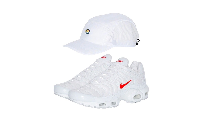 而近日,ins 情报账号 @dropsgg 透露,该款 Supreme x Nike Air Max Plus 白红配色将与同款运动棒球帽一同在本周迎来正式发售。目前采取什么发售形式暂且不知,但不妨锁定周四的 Supreme 发售日。