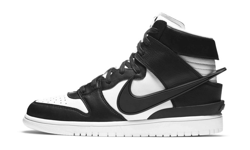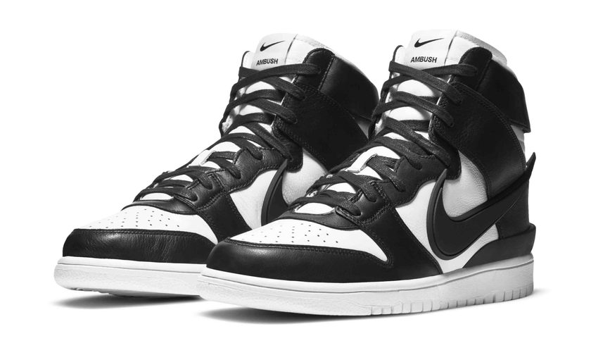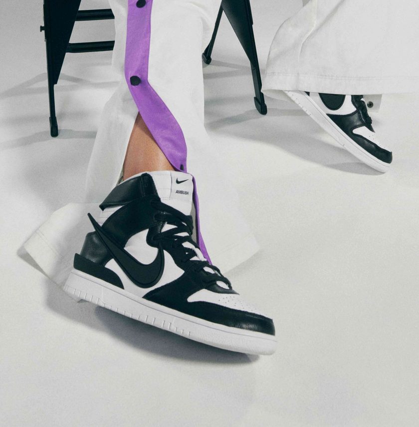 型录中上脚的是黑白 AMBUSH x Nike Dunk High ,这双鞋将日本的汽车、骑行等运动的感觉融入,所以 Swoosh 部分延伸,流线动感十足。