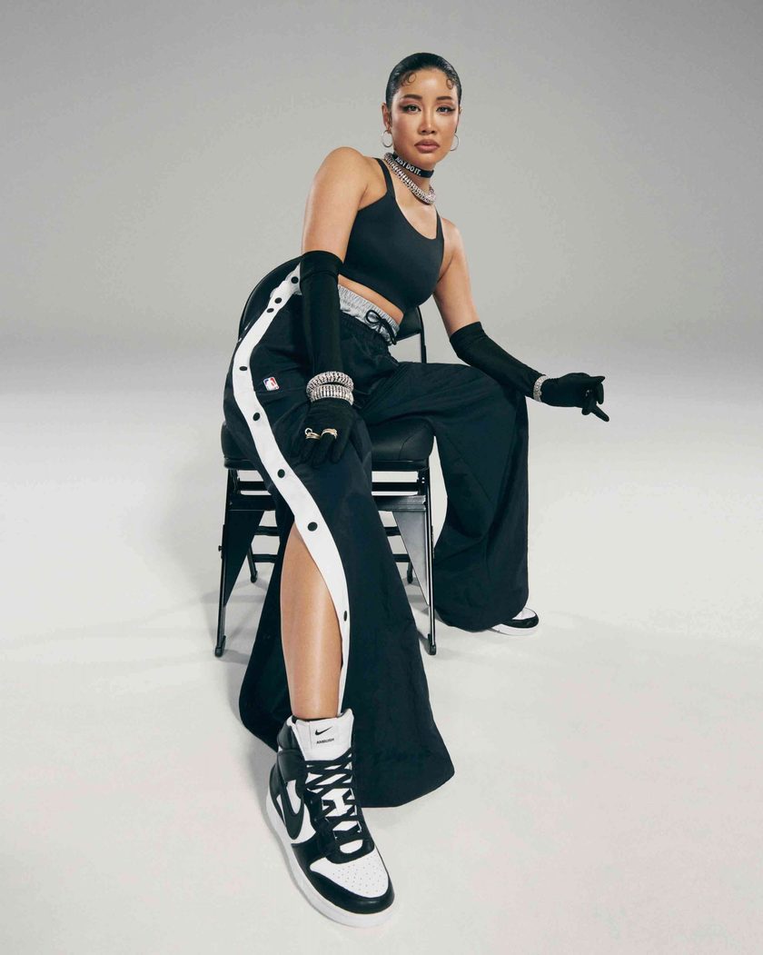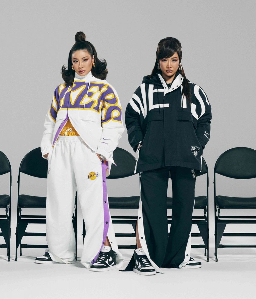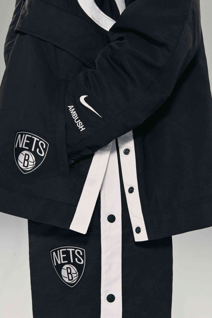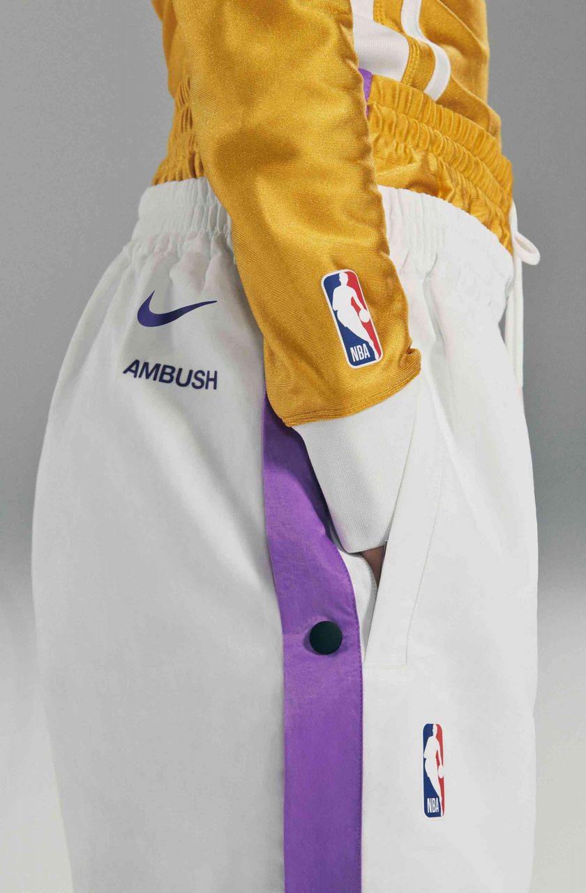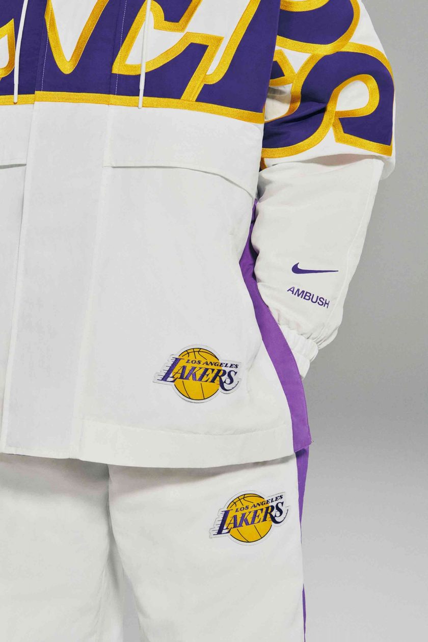 90 年代的运动领域和运动员们代表的时尚风格对 Yoon 有着很大影响,所以这次三方联名是以湖人队和篮网队为载体打造,将 AMBUSH 的独特时尚语言融入到了经典的球员服饰当中,带来外套夹克、热身长裤、长袖打底等多款单品。