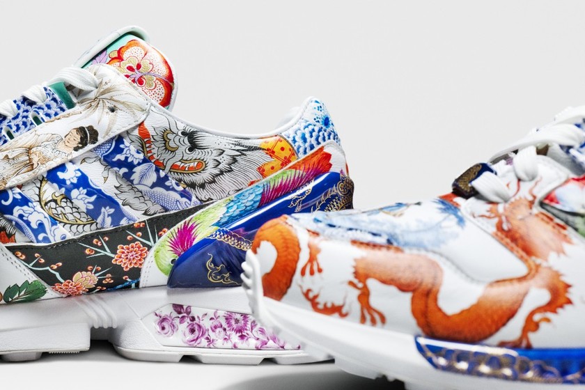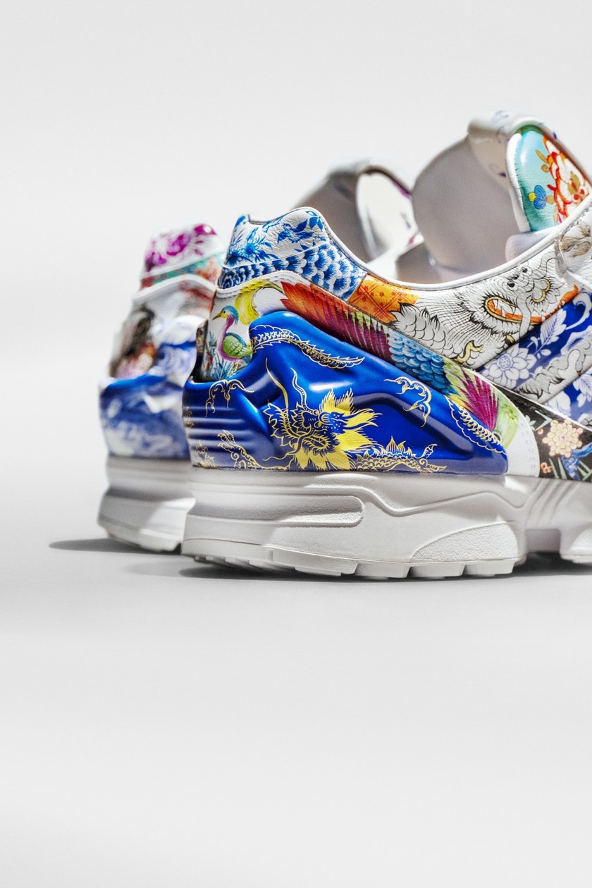 这款 ZX8000 虽然是一双鞋,但却在材质上结合了高级皮革与珍贵瓷器。鞋面设计灵感来源于 1856 年诞生的 Krater 花瓶,繁荣富丽,色彩鲜明的精心手绘便是选择了 Krater 花瓶中出现过的 15 种图案。