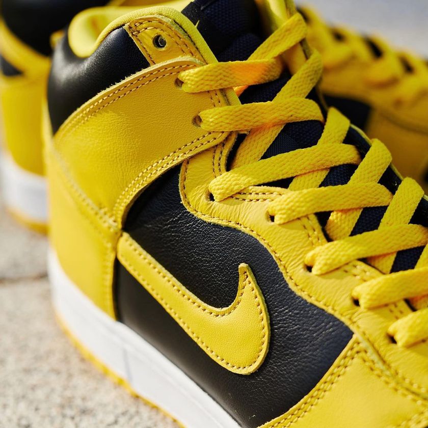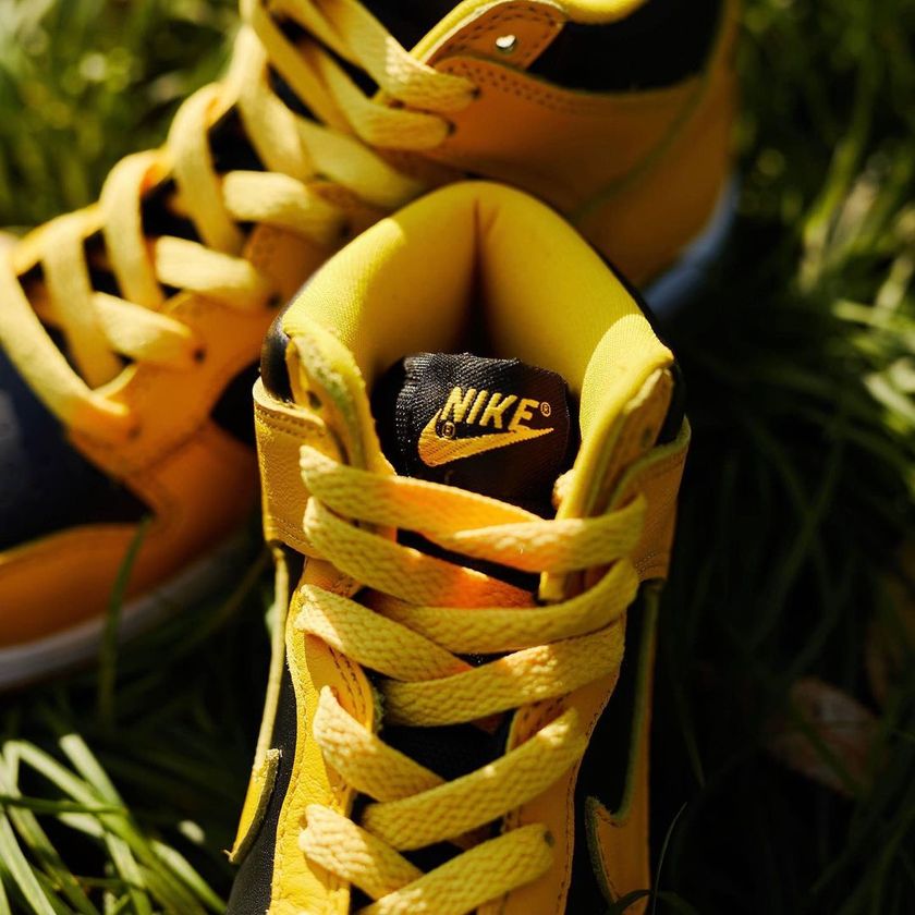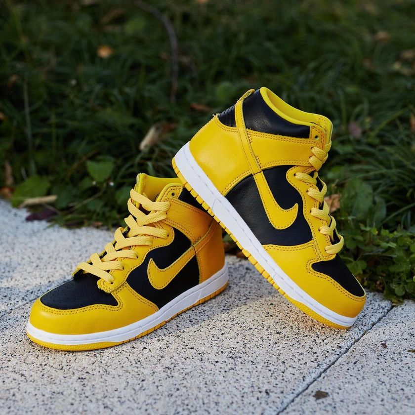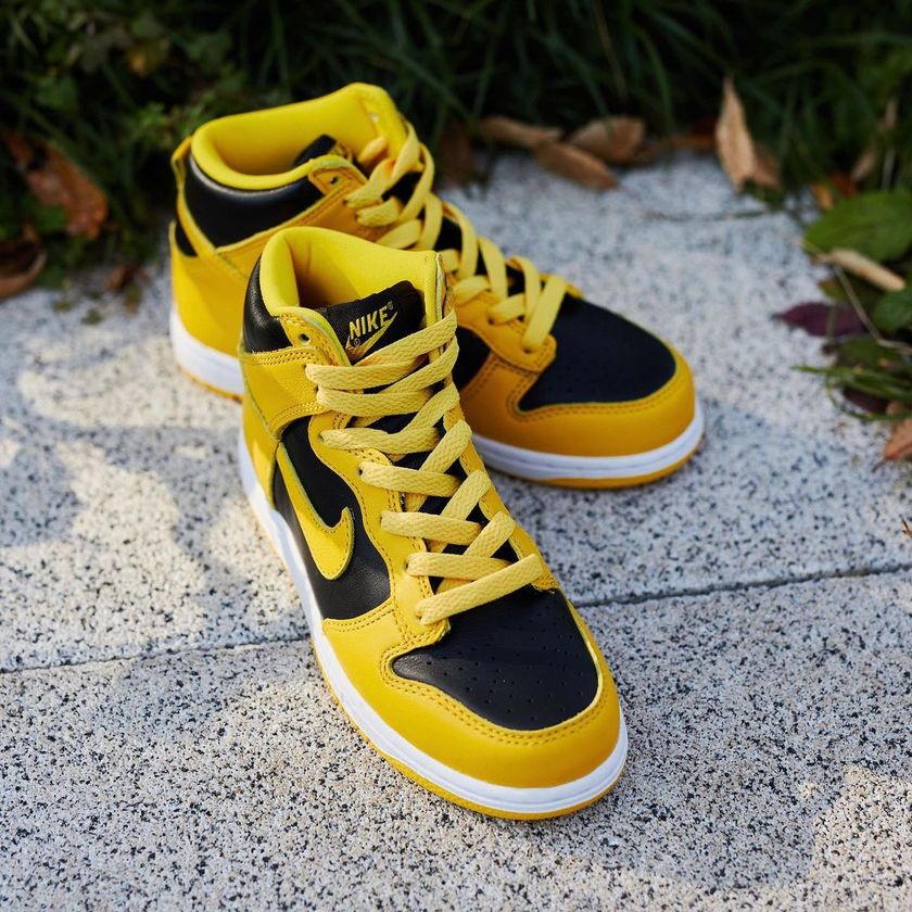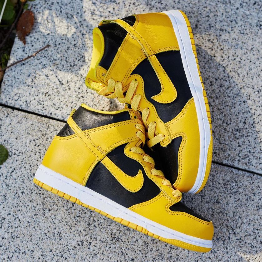 这款配色采用黑黄两色拼接而成,虽然是 12 年 "Varsity Maize" 配色的复刻版,但外观上更像 Dunk Hi 天价 “Wu-Tang”配色,特别是复刻版中底变成了白色不再是原版黑色之后。