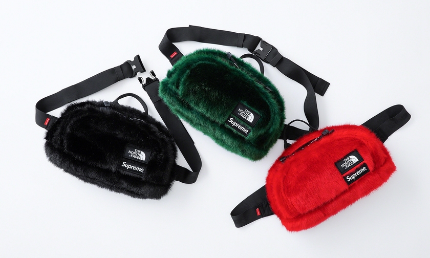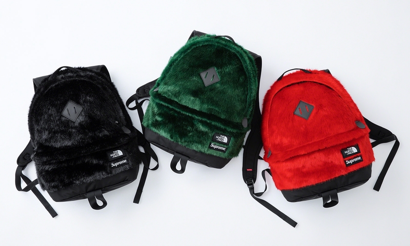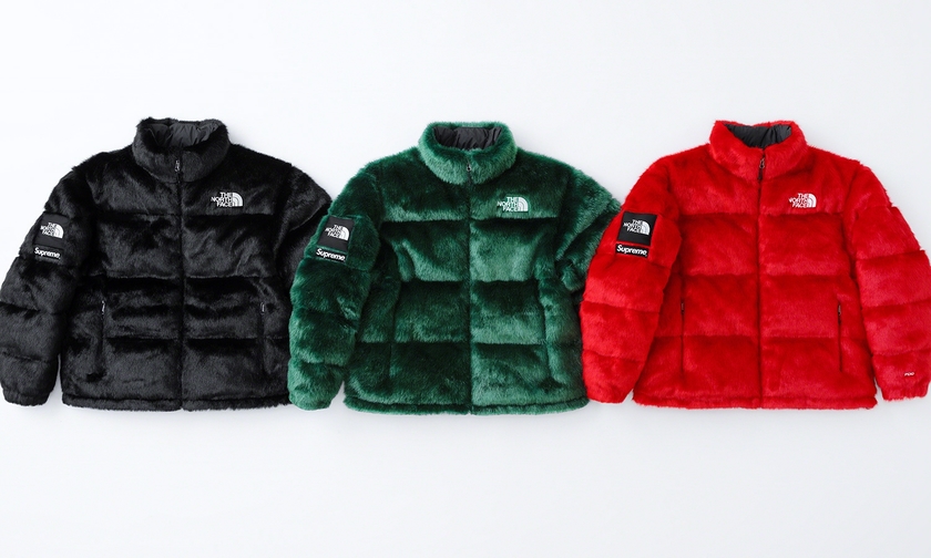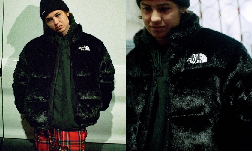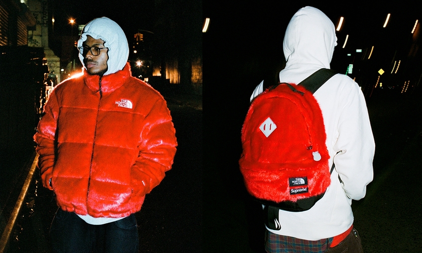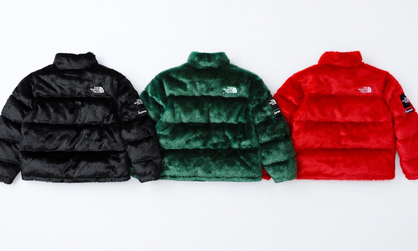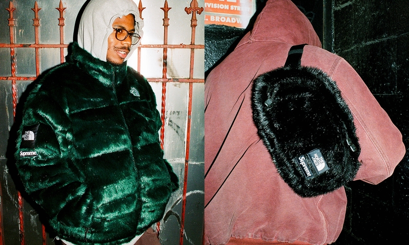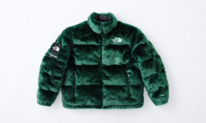 设计上以仿真皮草材质主打,以黑、绿、红三色作为设计主调,搭配辨识度高的 Supreme 与 THE NORTH FACE logo ,醒目又贵气十足。本周四正式与大家见面,这“皮草”系列,你喜欢吗?