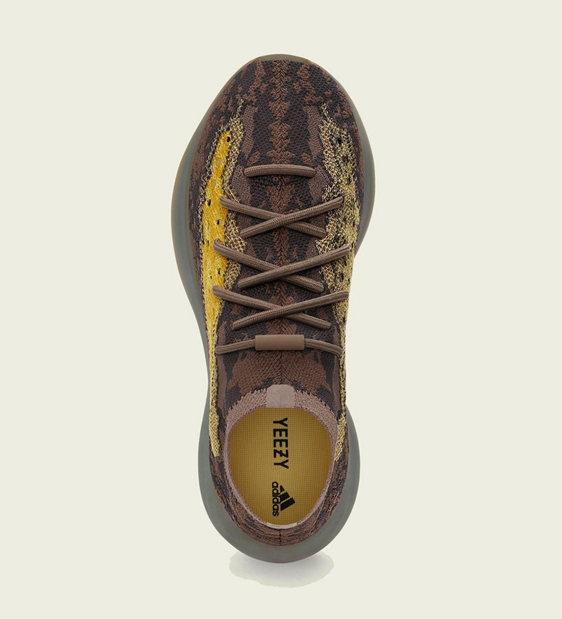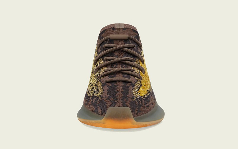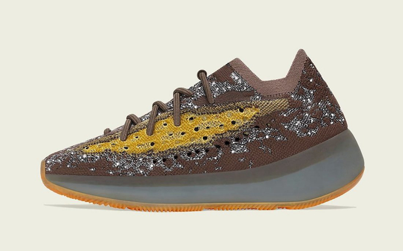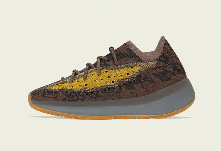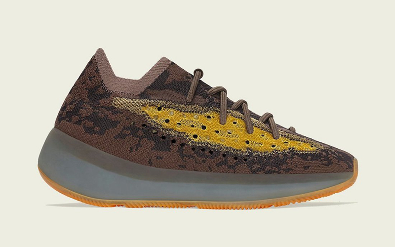 这款配色采用侃爷标志性大地色调呈现,鞋身以褐色为主基调,并配以亮黄色冲孔侧透点缀,整体视觉层次感分明,吸睛度也极强。