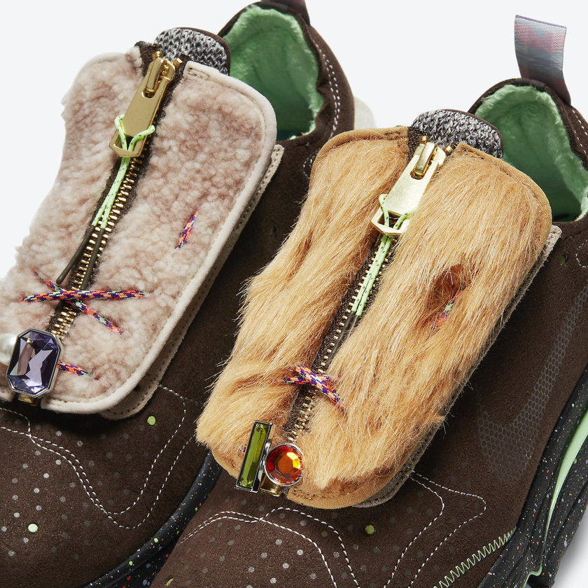 新配色采用棕色麂皮主打,最大的特点是鞋带部分增加了鞋盖,并且有摇粒绒和马毛两种材质选择。