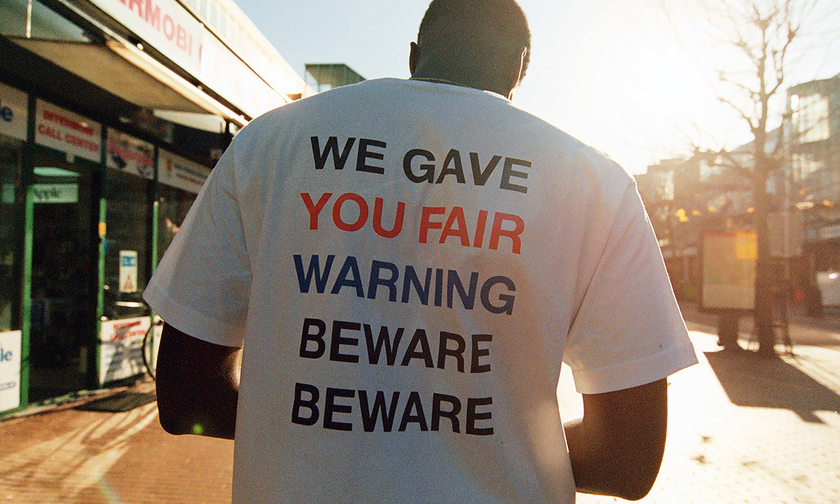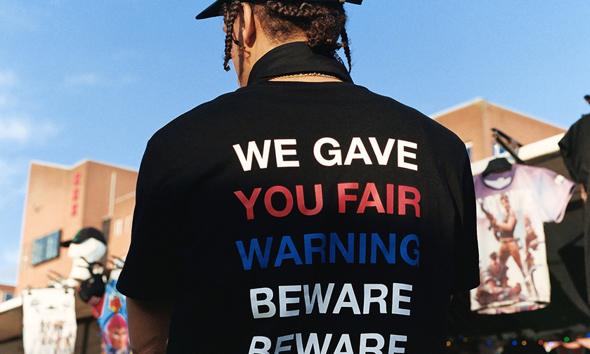 所有单品都融入了“We gave you fair warning, beware, beware”字样创意元素。黑白色调打底,搭配红蓝细节,单品设计虽简单,但街头不羁感十足。
