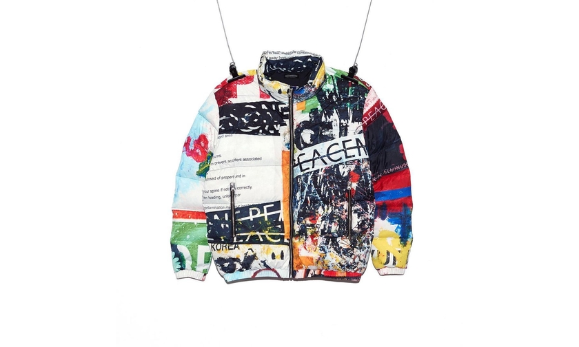 系列包括羽绒外套、摇粒绒卫衣、丹宁西装外套、背带裤等服饰单品,亮点设计为羽绒外套上的涂鸦印花,与 AF 1 联名是同款。